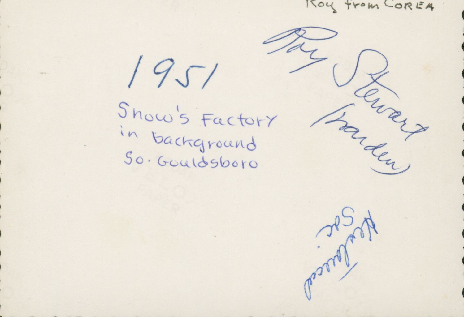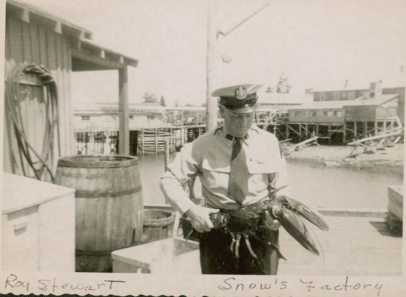 Roy Stewart holding a giant lobster. Snow's Factory in the background.Photograph Details