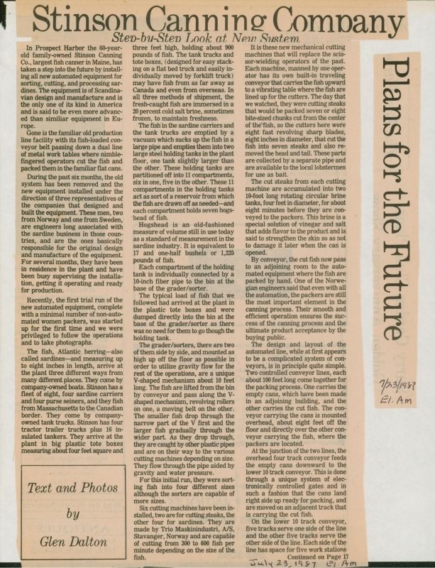 A clipping about the Stinson Canning Company in Prospect Harbor.Publication Details