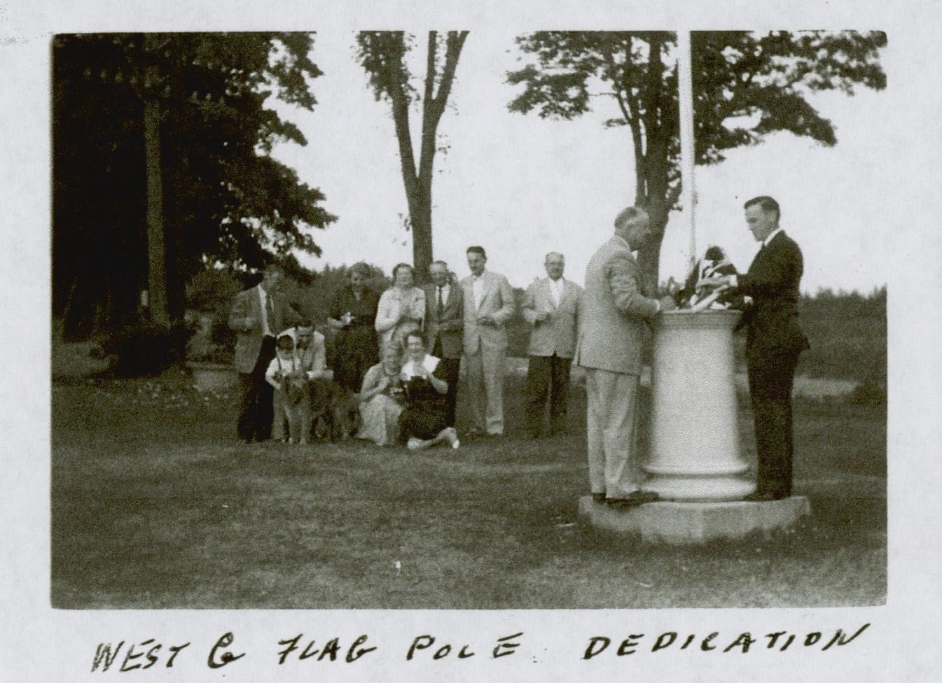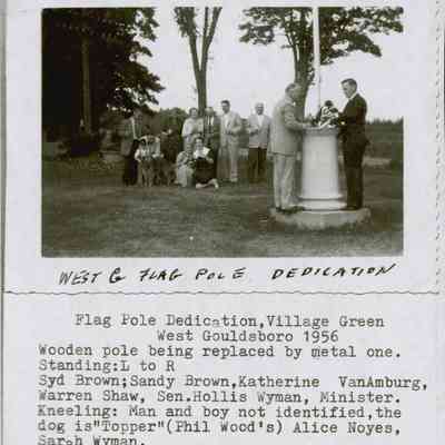 Dedicating the new metal Flag Pole on the West Gouldsboro Village Green in 1956. Names of the participants are listed on the second attachment.Photograph Details