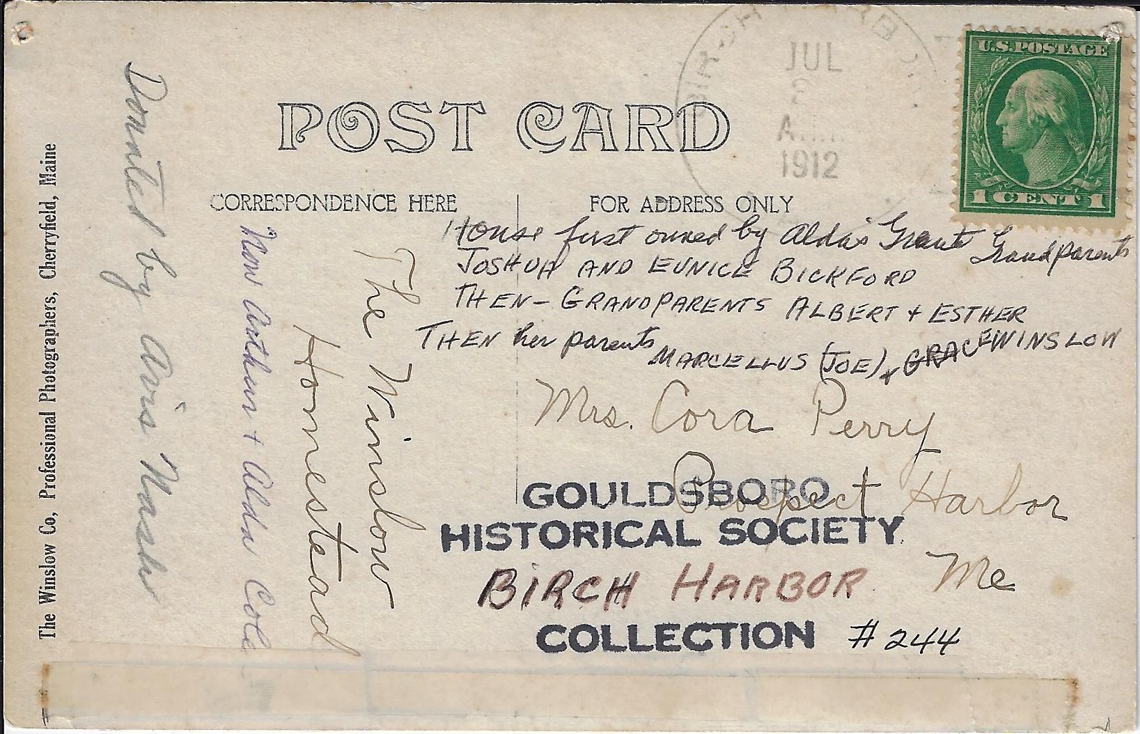 Winslow Homestead in Birch Harbor, Maine was owned by multiple generations beginning with Joshua and Eunice Pettee Bickford, Miles and Esther Crane Bickford, Albert and Esther Winslow, Marcellus and Grace Winslow, and Arthur and Alda Cole.Photograph Details