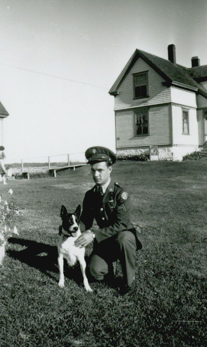 Gordon Russell Workman in his U. S. Army uniform with his dog, Pal, at the Keeper's Cottage at the Prospect Harbor Lighthouse.Photograph Details