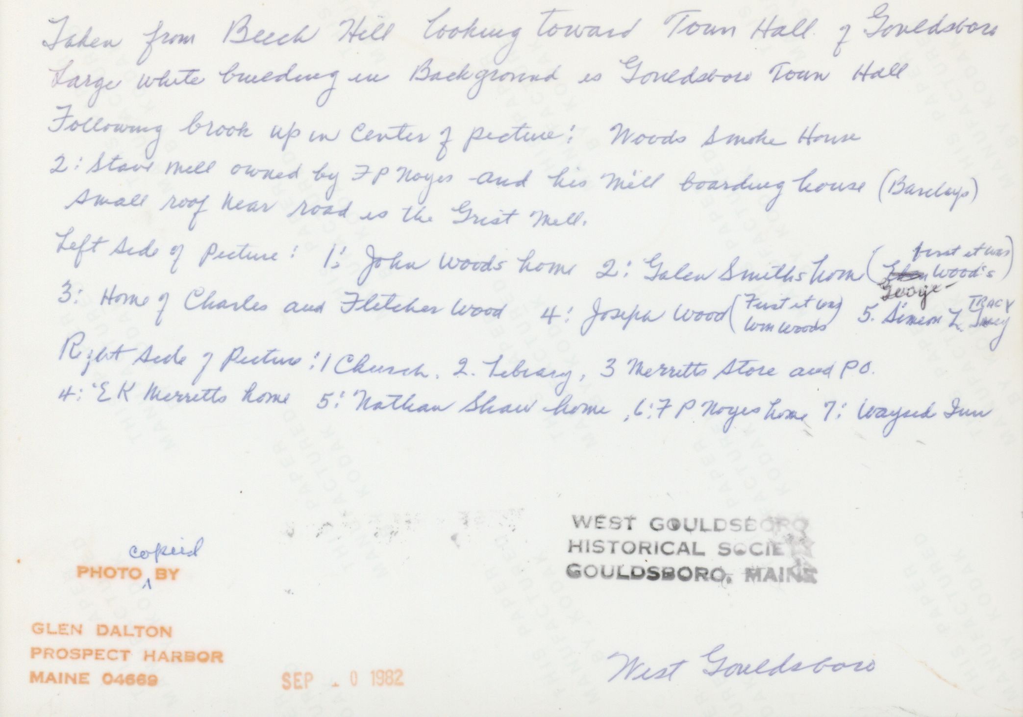 View of Gouldsboro Town Hall from Beech Hill. Information about the buildings on the back.Photograph Details