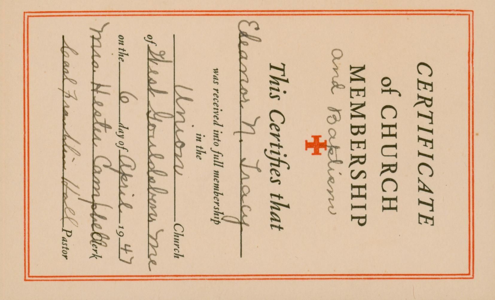 Membership and Baptismal certificate for Eleanor Tracy.Archive Details