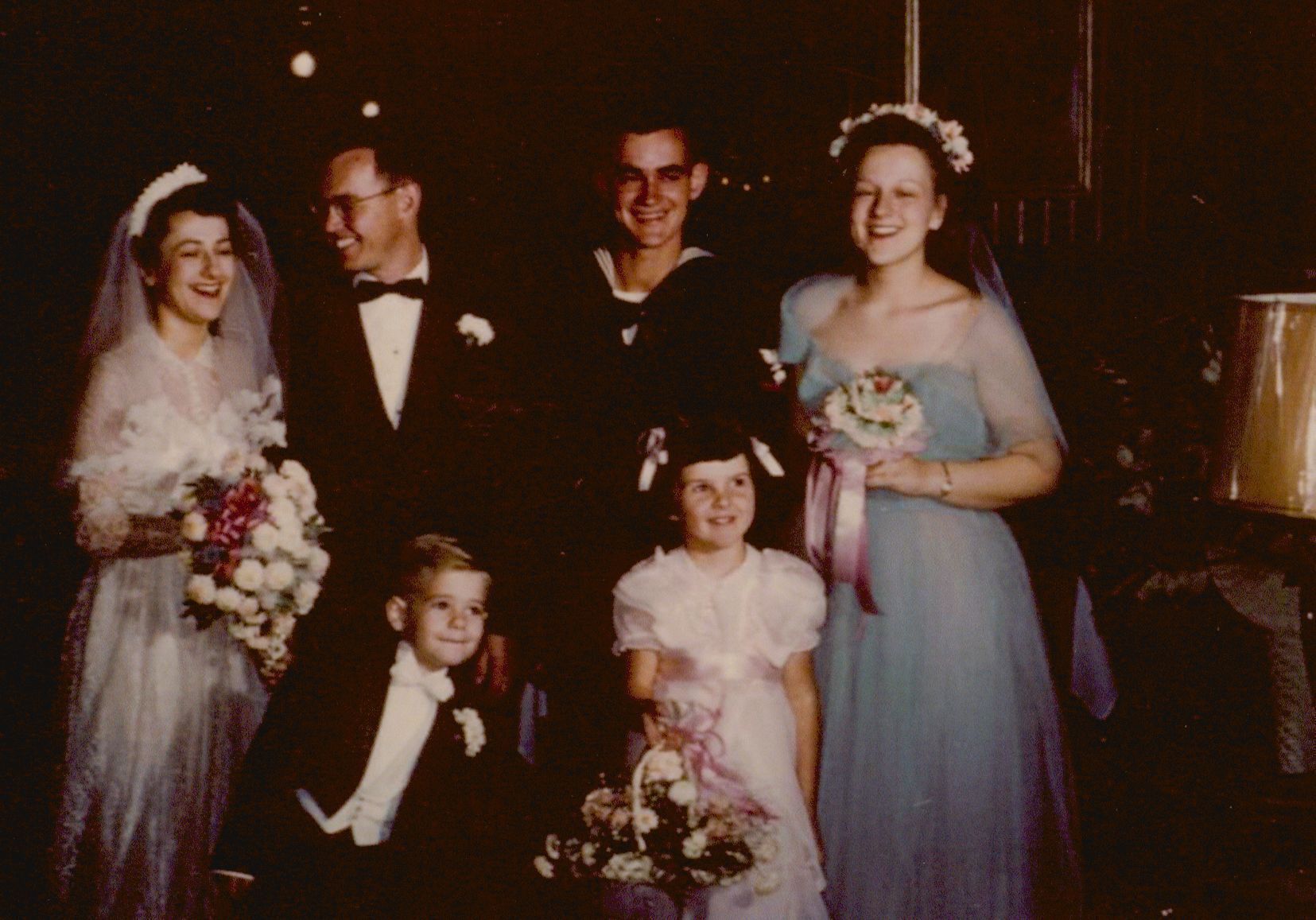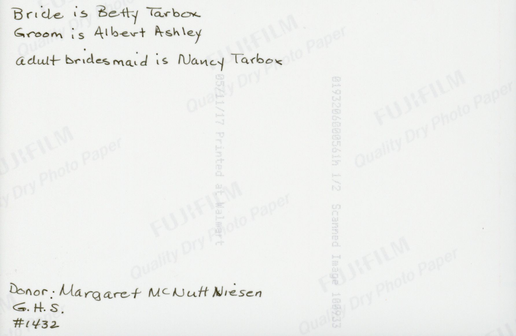Tarbox - Ashley Wedding photo. Bride is Betty Tarbox. Groom is Albert H. Ashley. Adult bridesmaid is Nancy Tarbox.Photograph Details