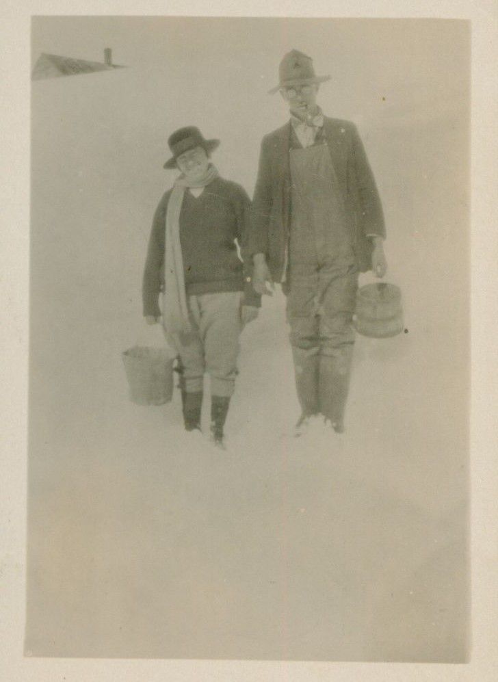 Two people walking in the snow carrying bucketsEntry/Object ID