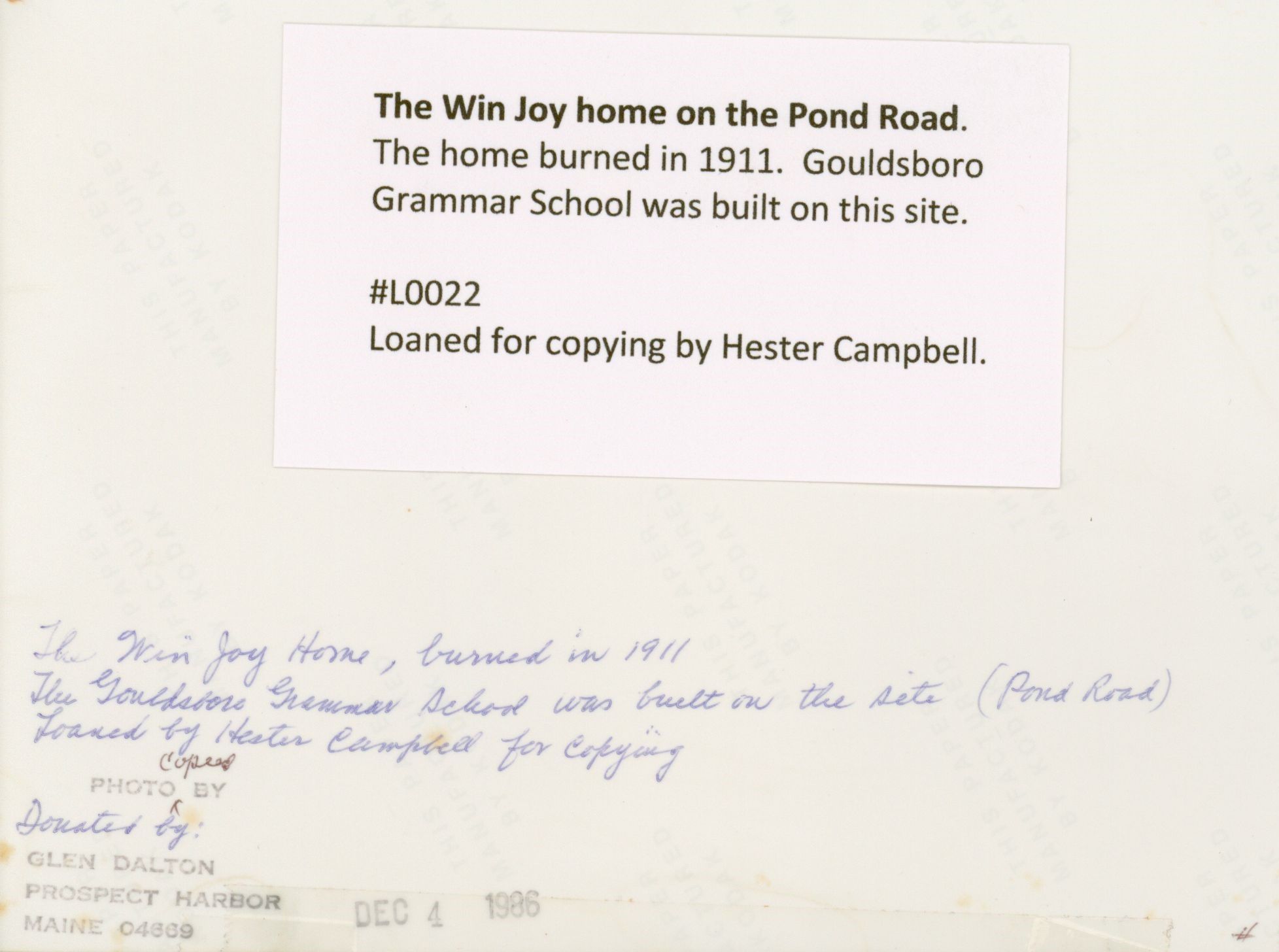 Win Joy house on Pond Road. The house burned in 1911. The Gouldsboro Grammar School was later built on the site.Photograph Details