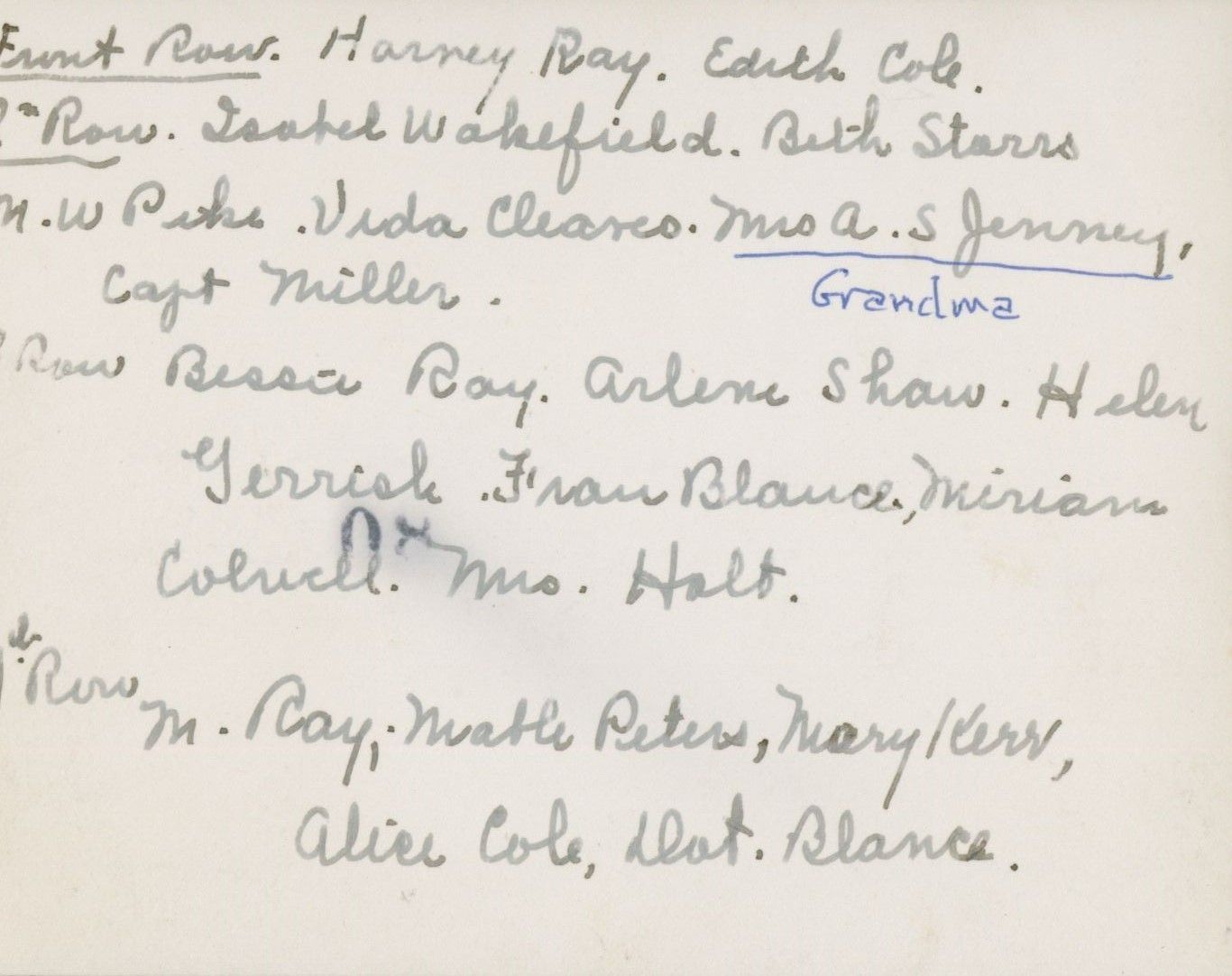 Second row: Isabel Wakefield. Beth Starrs. H. W. Pike (?). Vida Cleaves. Mrs. A. S. Jenney. Captain Miller.