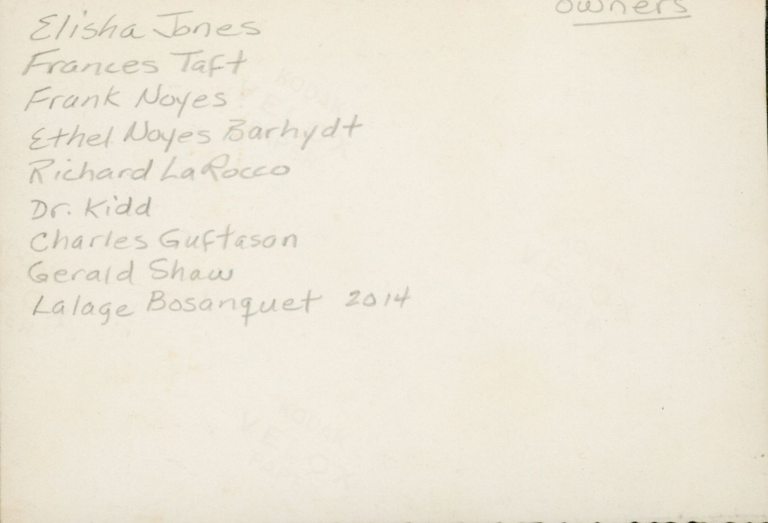 List of owners on the back of the photo: Nathan Jones, Frances Taft, Frank Noyes, Ethel Noyes Barhydt, Richard LaRocco, Dr. Kidd, Charles Gustafson, Gerald Shaw, Lalage Bosanquet.Photograph Details