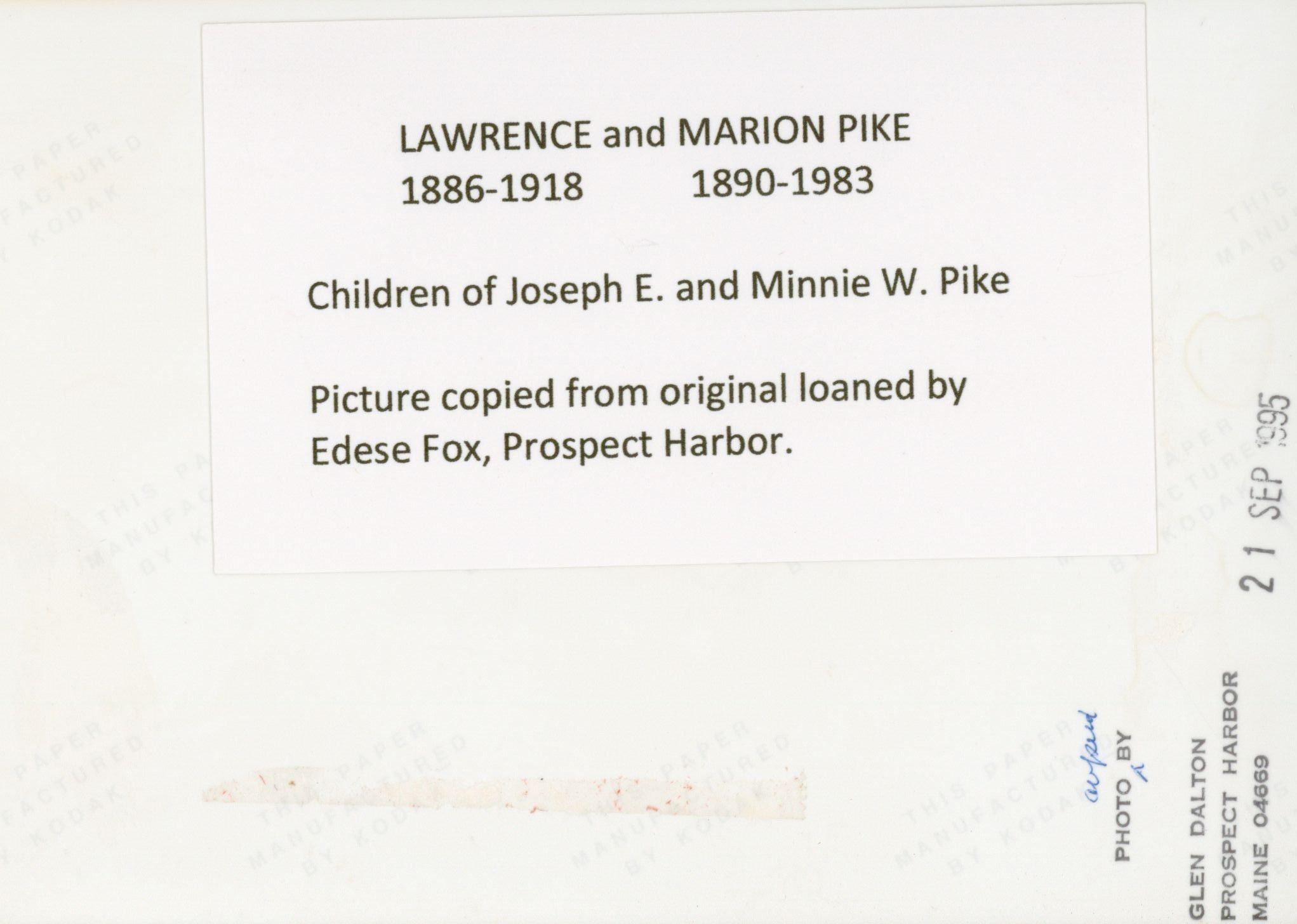 Pike, Lawrence Guptill (1892 - 1918), Ray, Marion Elizabeth Pike (1890 - 1982)., Pike, Joseph Everett, Pike, Eleanor Minnie Weston (1866 - 1957).Subject Place