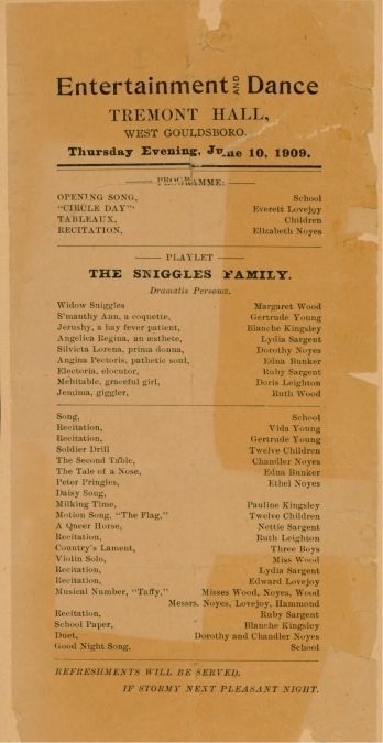 Program for dance at the Tremont Hall in West Gouldsboro, Maine on Thursday, June 10, 1909. Includes tickets for multiple dates.Relationships