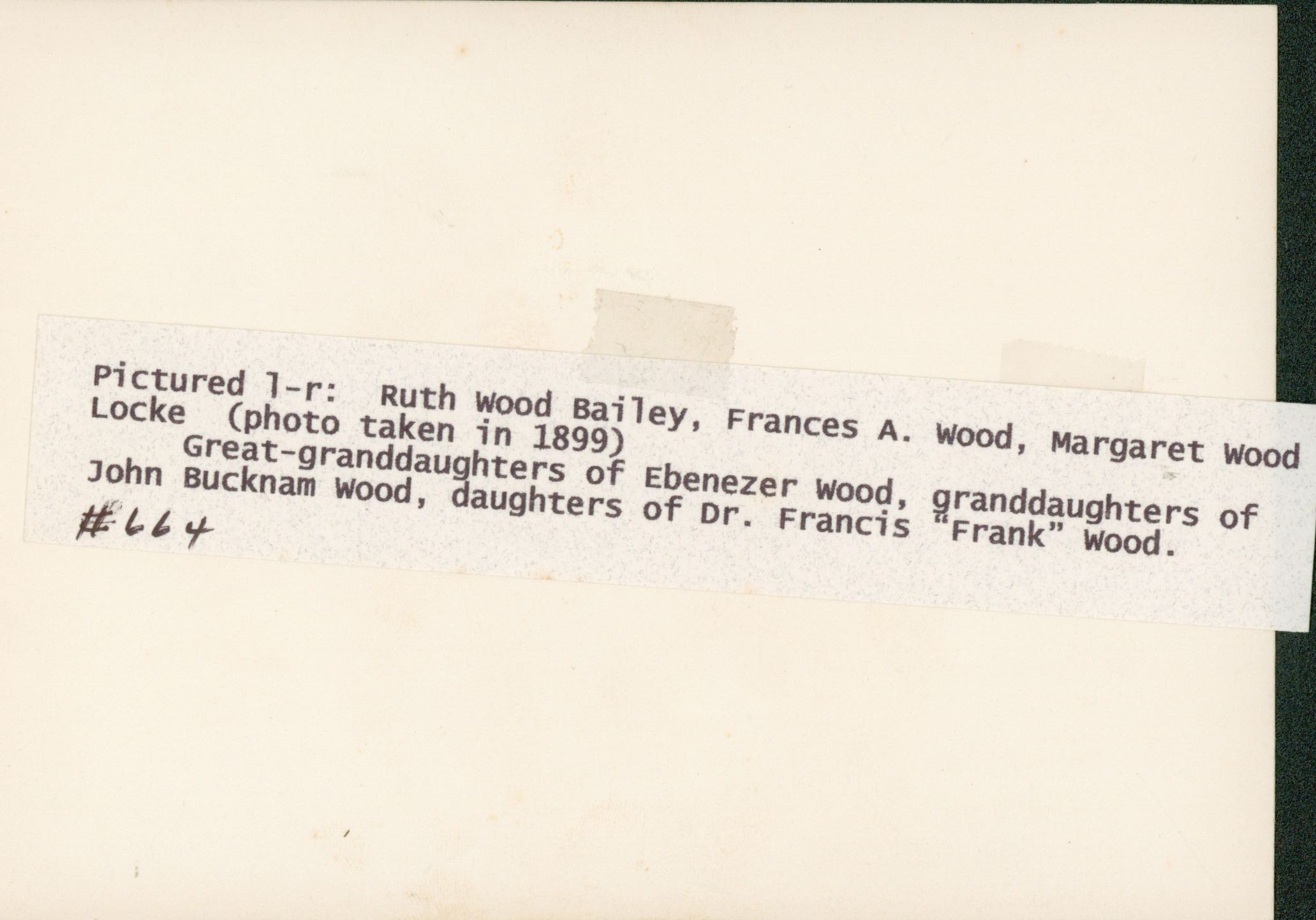 Great-granddaughters of Ebenezer Wood. Pictured from left to right: Ruth Wood, Frances A. Wood, and Margaret Wood, daughters of Dr. Francis L. Wood and Jennie Andrews Wood.Photograph Details
