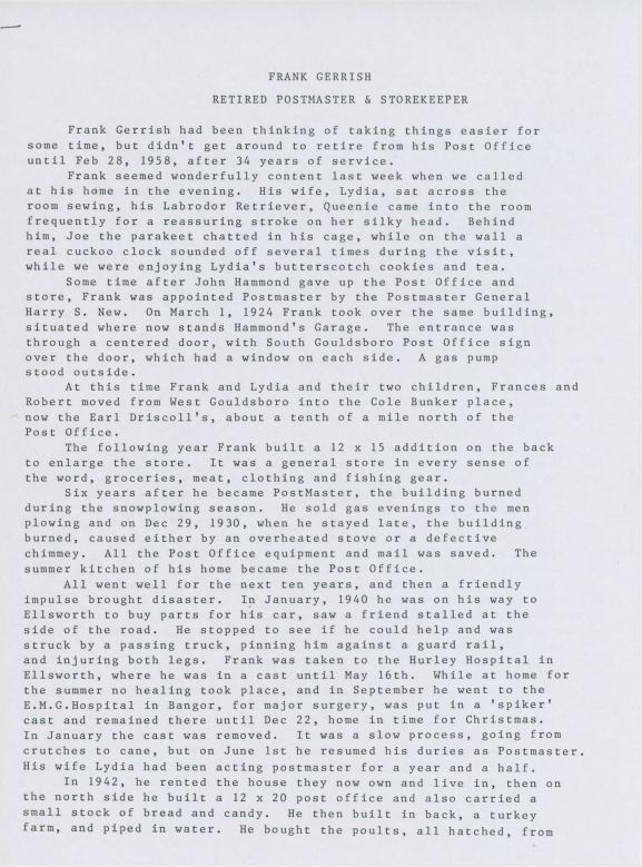 Biography of Frank Gerrish of South Gouldsboro by Bernice Richmond in the Peninsula Gazette. Postmaster and storekeeper.Publication Details