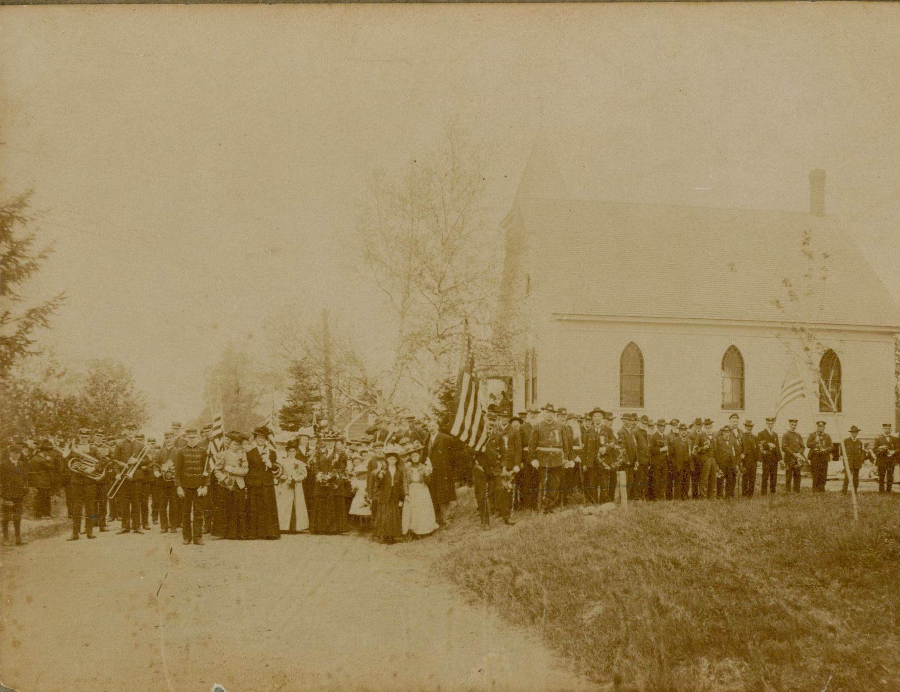 G.A.R. Meeting participants in South Gouldsboro. Union Church in the background. Circa 1900.Photograph Details