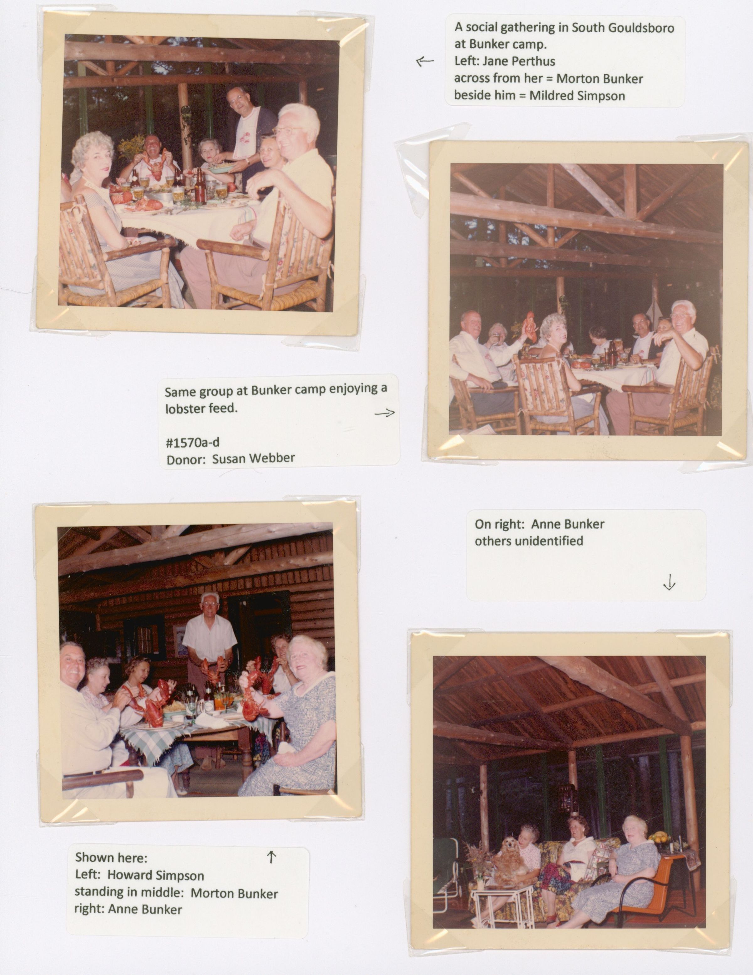 Gathering at the Bunker Camp in South Gouldsboro. Four photos of people gathered around a table. Some people are identified.Photograph Details