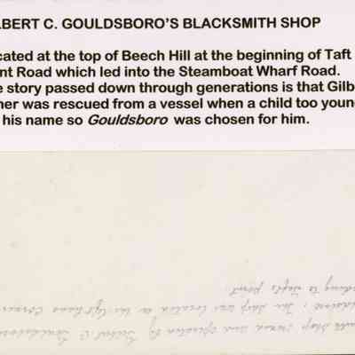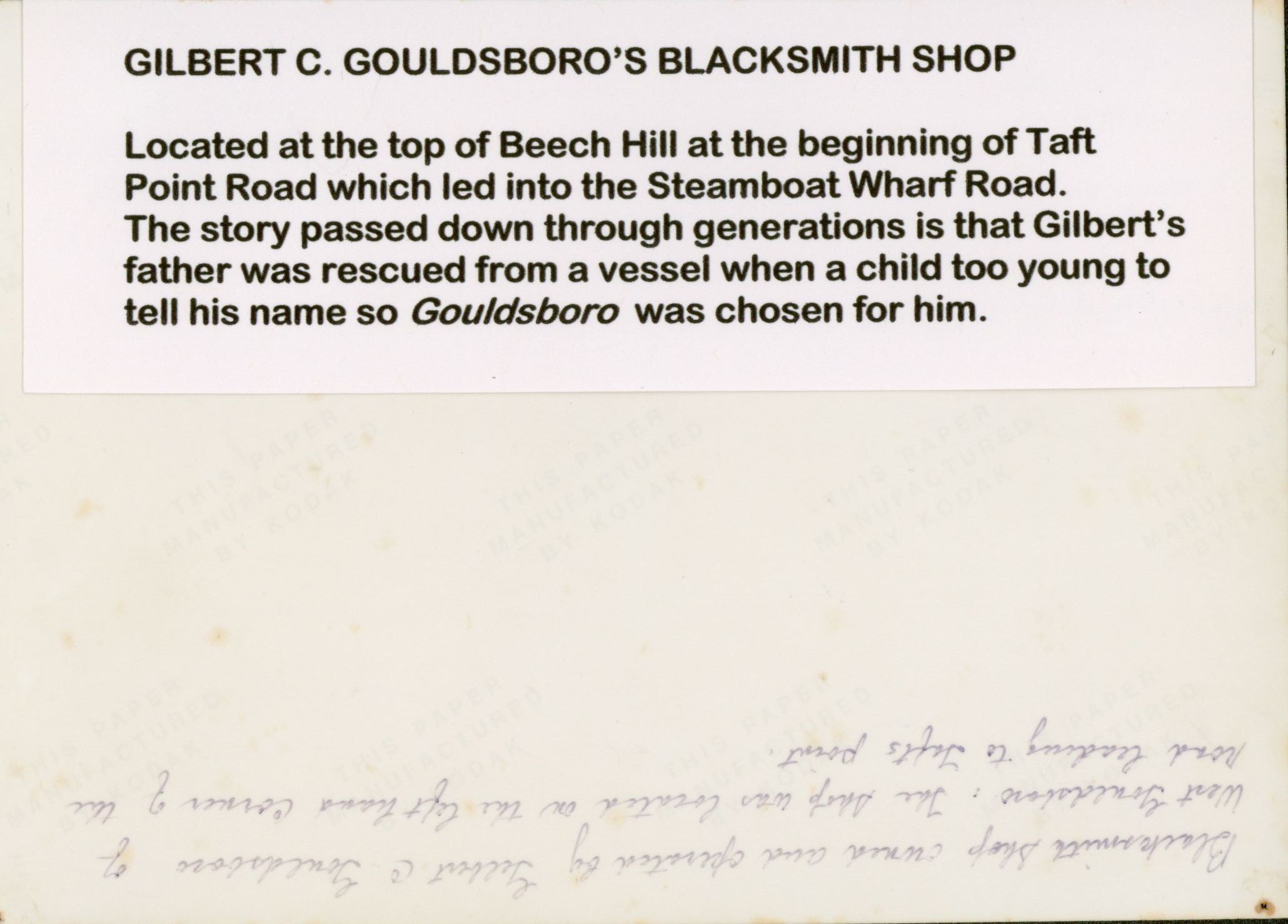 Gilbert C. Gouldsboro's Blacksmith Shop. Located at the top of Beech Hill at the beginning of Taft Road, which led to the Steamboat Wharf Road.