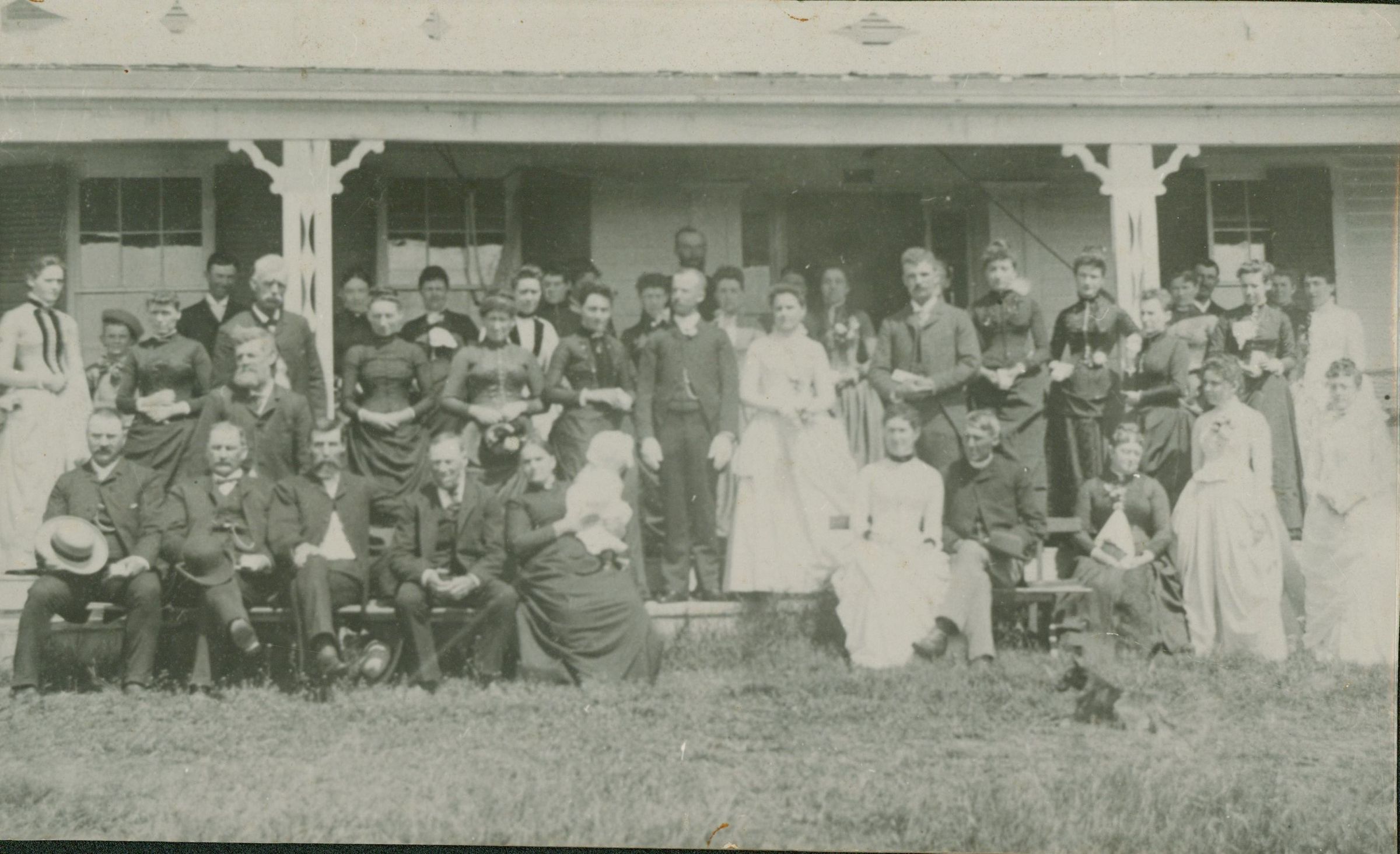 Guests at the Wedding of Lulu Nash and Fred Bradway. June 22, 1888. On bench infront, second from the right is Isaac McCallum. His wife, Mary, is thought to be the owmn in the front row holding a baby.Photograph Details