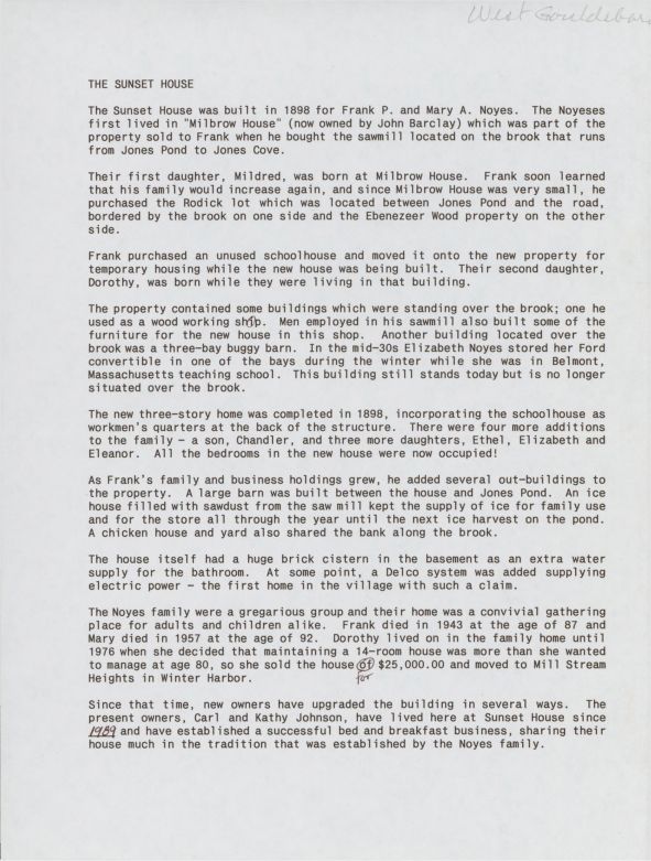 History of the Frank P. and Mary A. Noyes House, also known as the Sunset House.