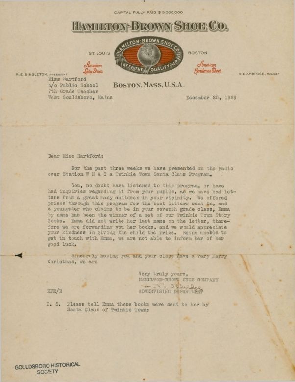 Letter from Hamilton-Brown Shoe Company to West Gouldsboro School Teacher, Miss Hartford. A student named Emma won a prize for a letter to Santa submitted to the Twinkle Town Santa Claus Program. She didn't include her last name so the company sent her prize - several books - to the teacher.Update Date