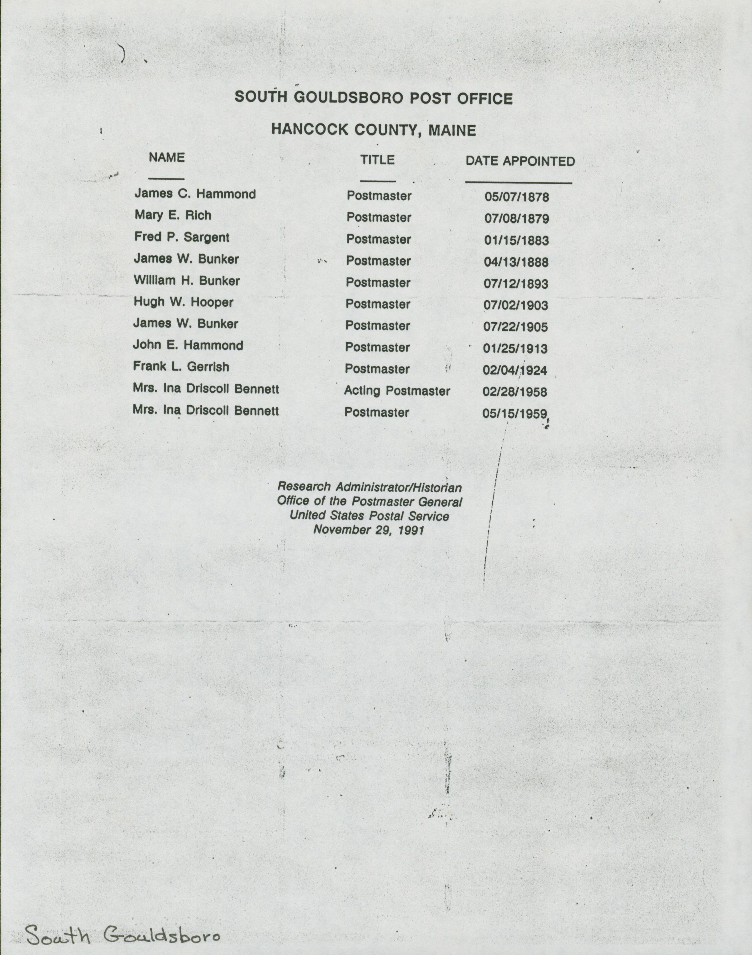 List of Postmasters in South Gouldsboro, Maine (1878 - 1959).Entry/Object ID