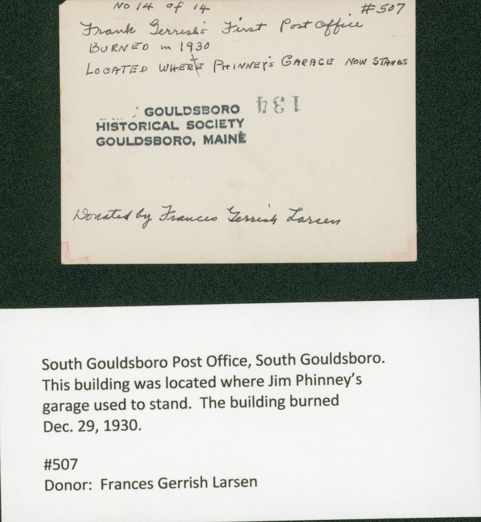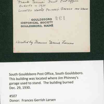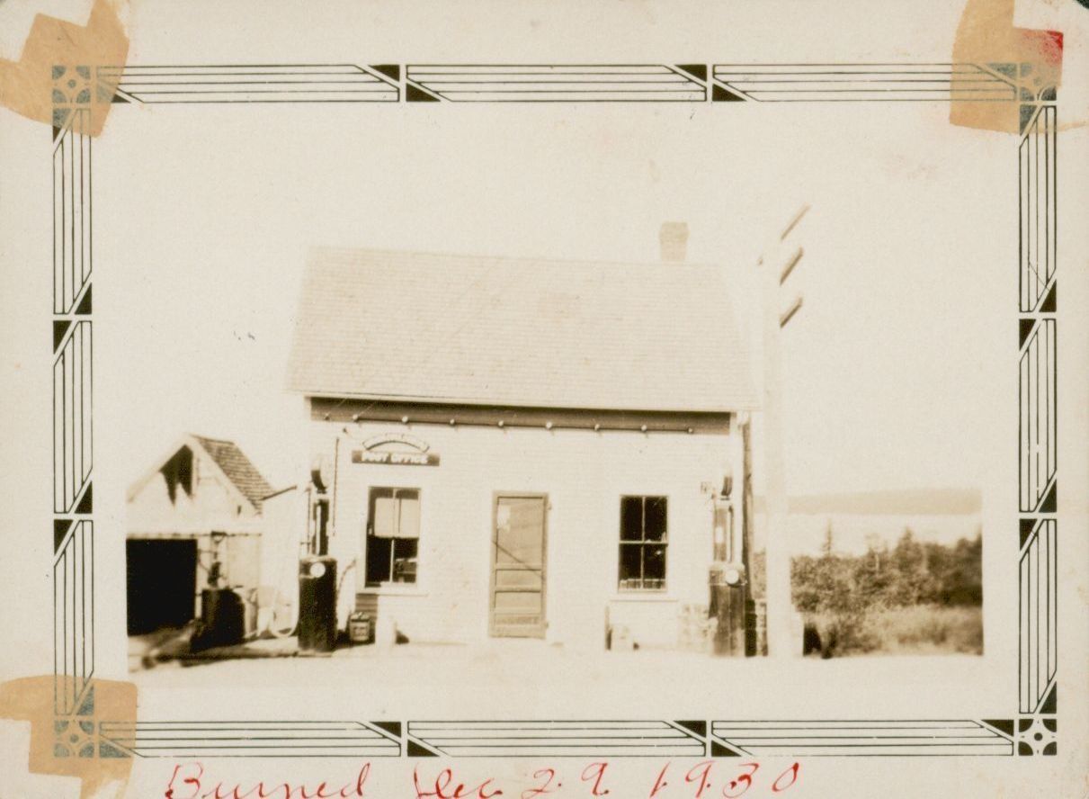 South Gouldsboro Post Office. Burned on December 29, 1930. This building was located where Jim Phinney's garage used to stand.Photograph Details