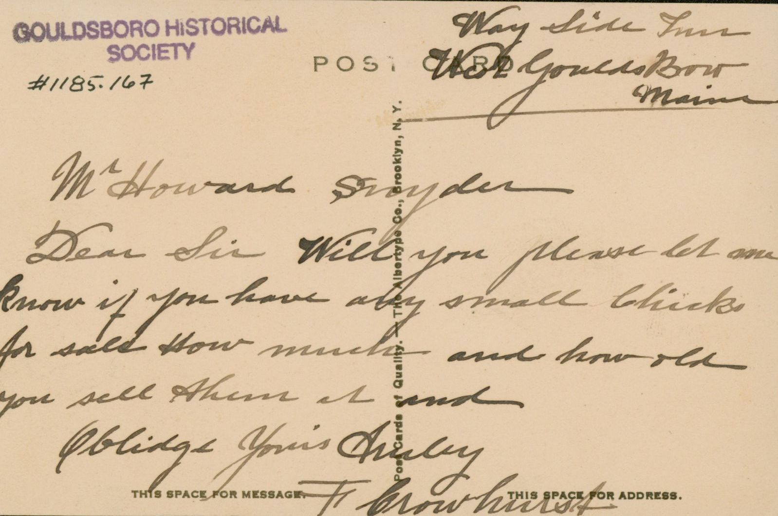 Includes note to Mr. Howard Snyder from Frank Crowhurst regarding purchase of chickens.Subject Person/Organization