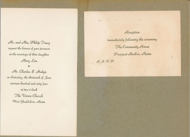 Wedding Invitation for Mary Lou Tracy and Charles Hodge at the West Gouldsboro Union Church on June 13, 1964. Includes RSVP card.Relationships