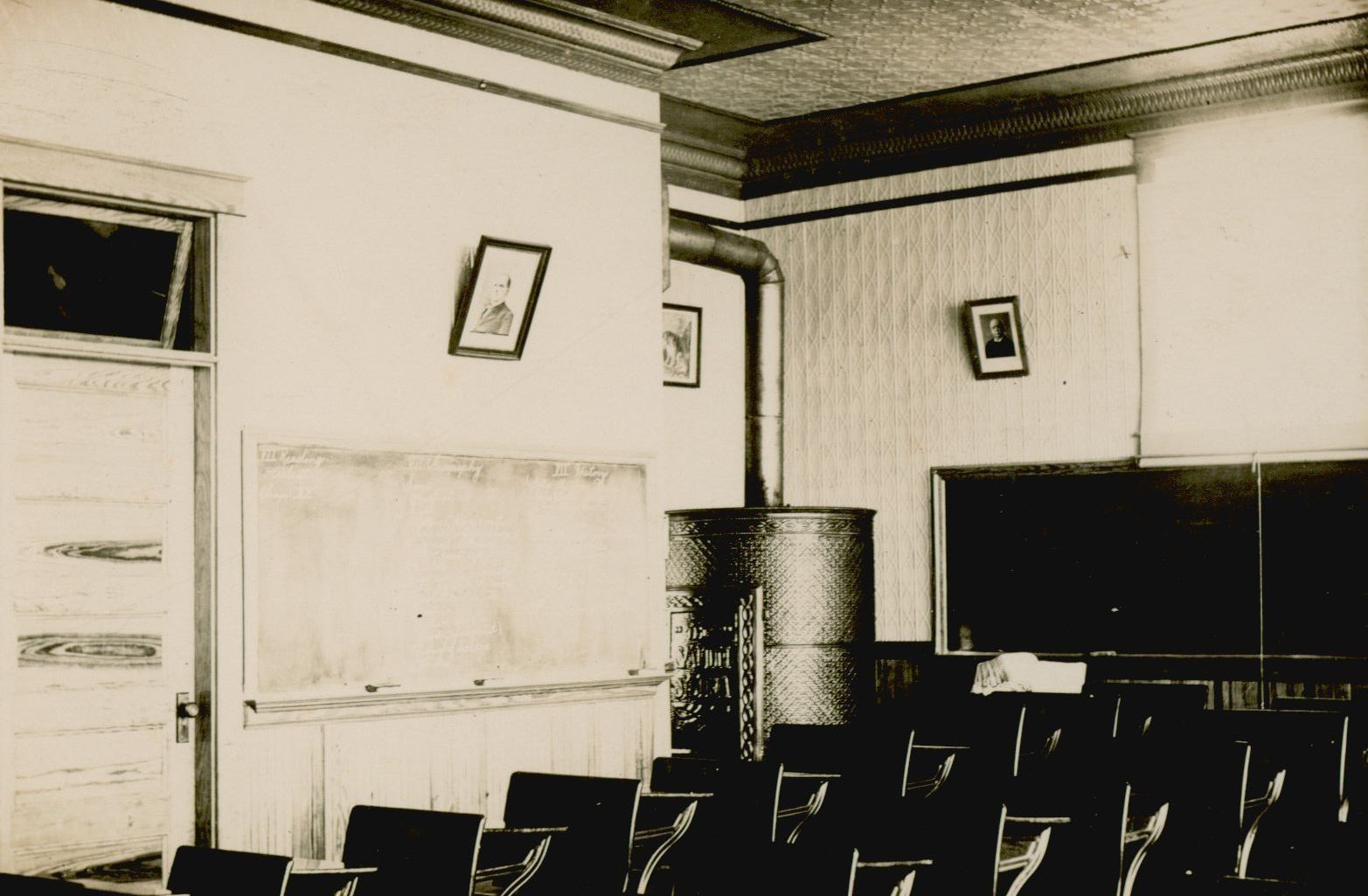 West Gouldsboro Village School Interior. Blackboards. Stove.