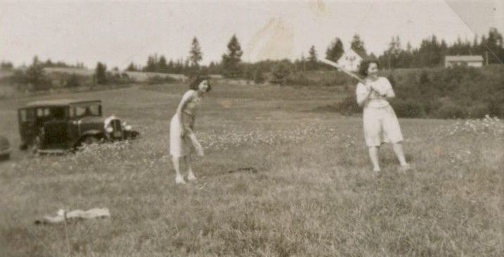 Women playing baseball in field adjacent to the Wayside Inn. Gouldsboro Town House and Tavern in the distance.Photograph Details