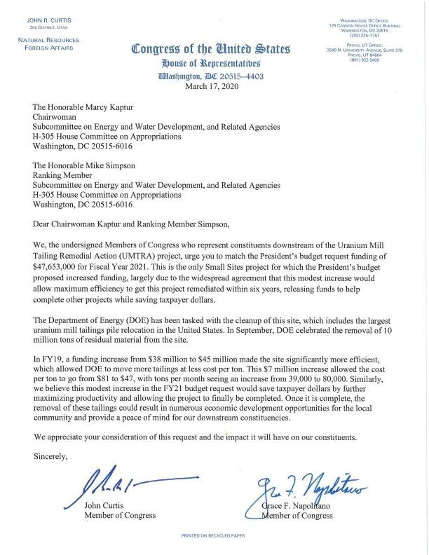 Letters asking for appropriations to help fund the Uranium Mill Tailing Remedial Action (UMTRA) project to clean up the largest uranium mill tailings pile in the US, located in Moab, Utah.Collection