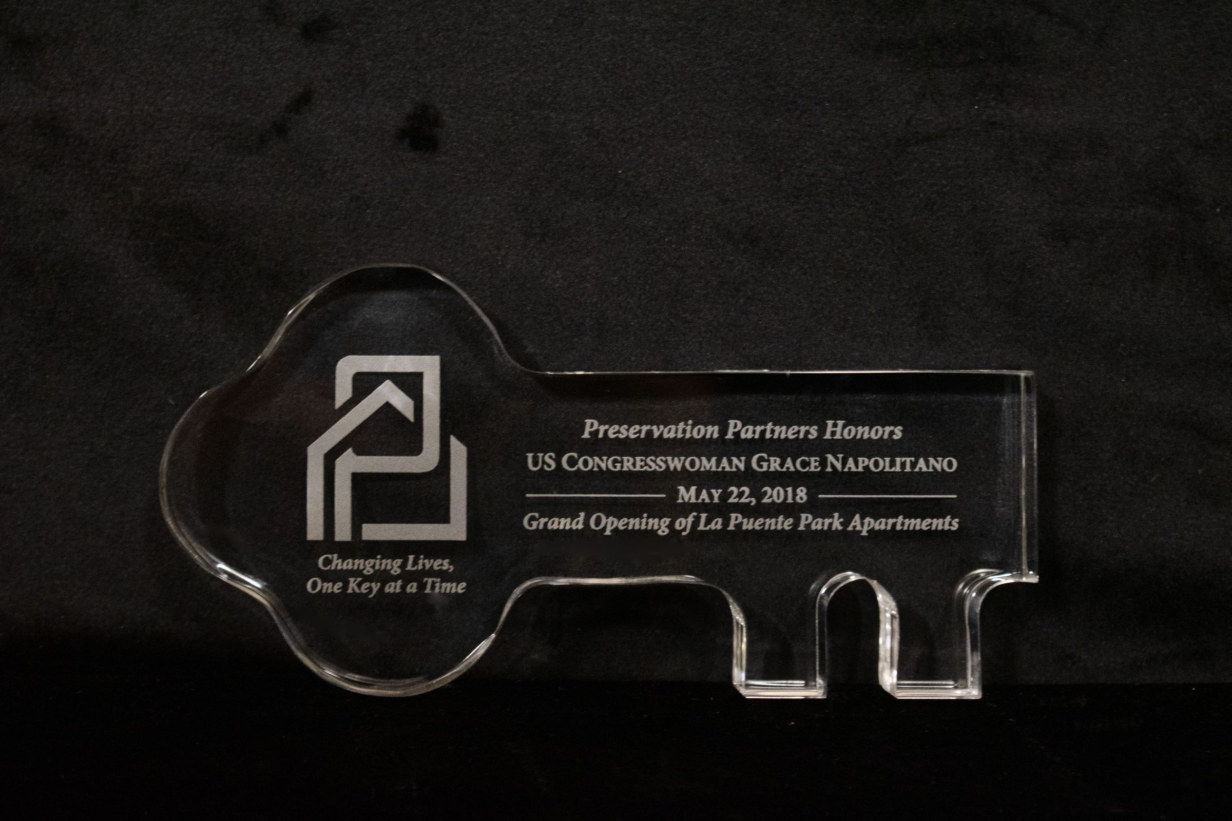 Glass award shaped like a key reading "Preservation Partners Honors US Congresswoman Grace Napolitano, May 22, 2018, Grand Opening of La Puente Park Apartments."Collection