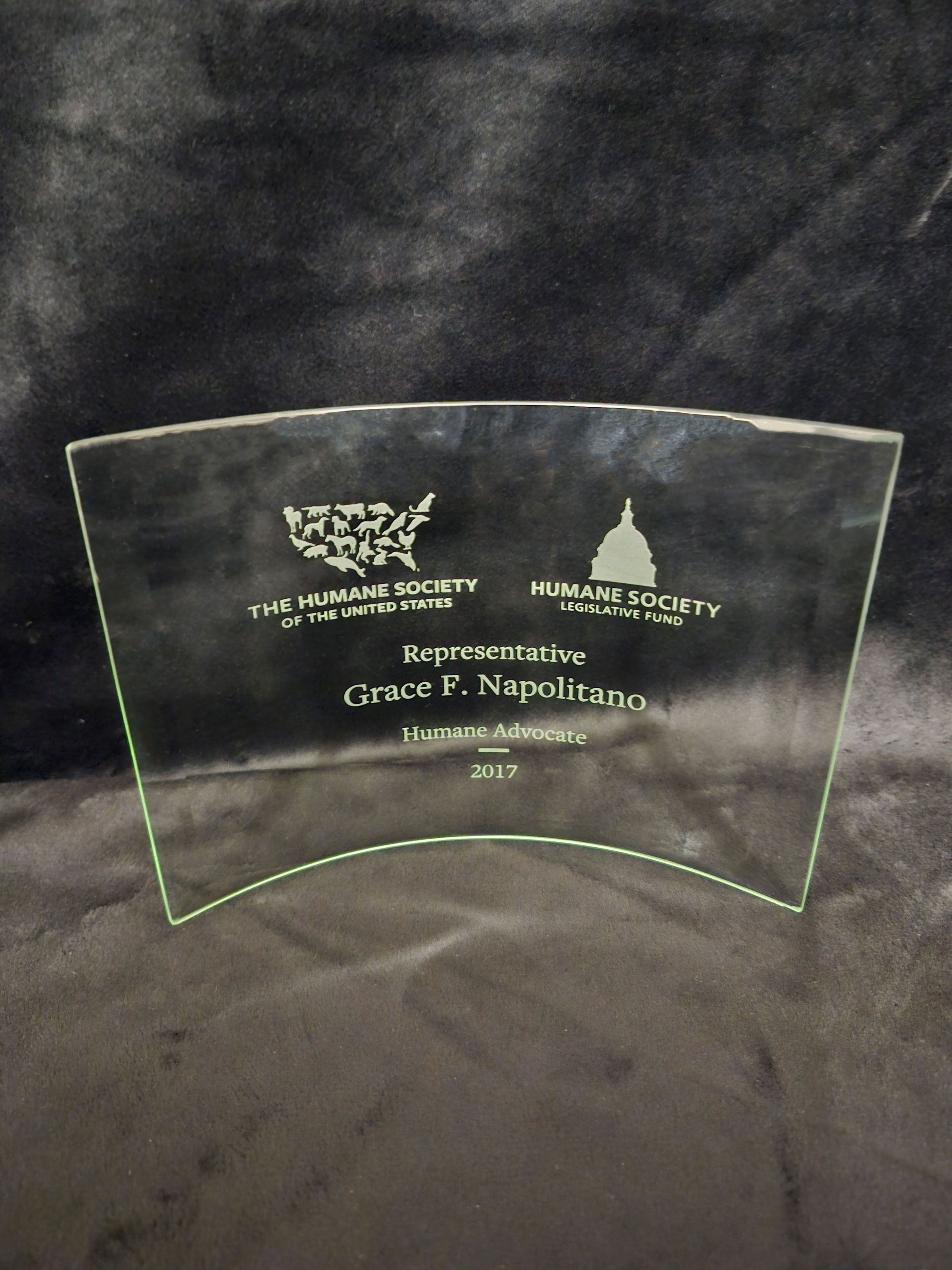 Curved glass plate award from the Humane Society of the United States and the Humane Society Legislative Fund reading "Representative Grace F. Napolitano, Humane Advocate, 2017."Lexicon