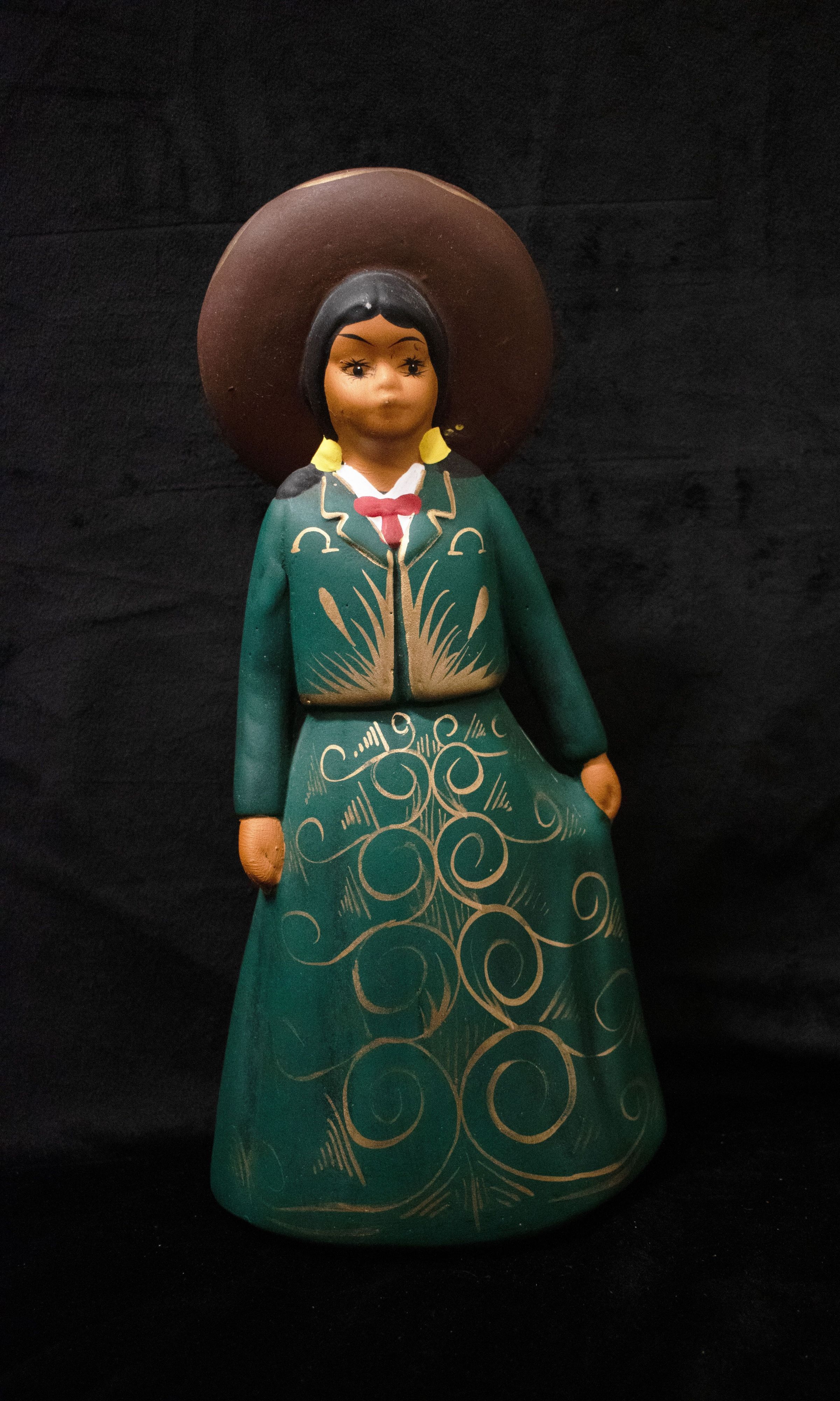 Ceramic Mexican doll wearing a green dress and hat.Collection