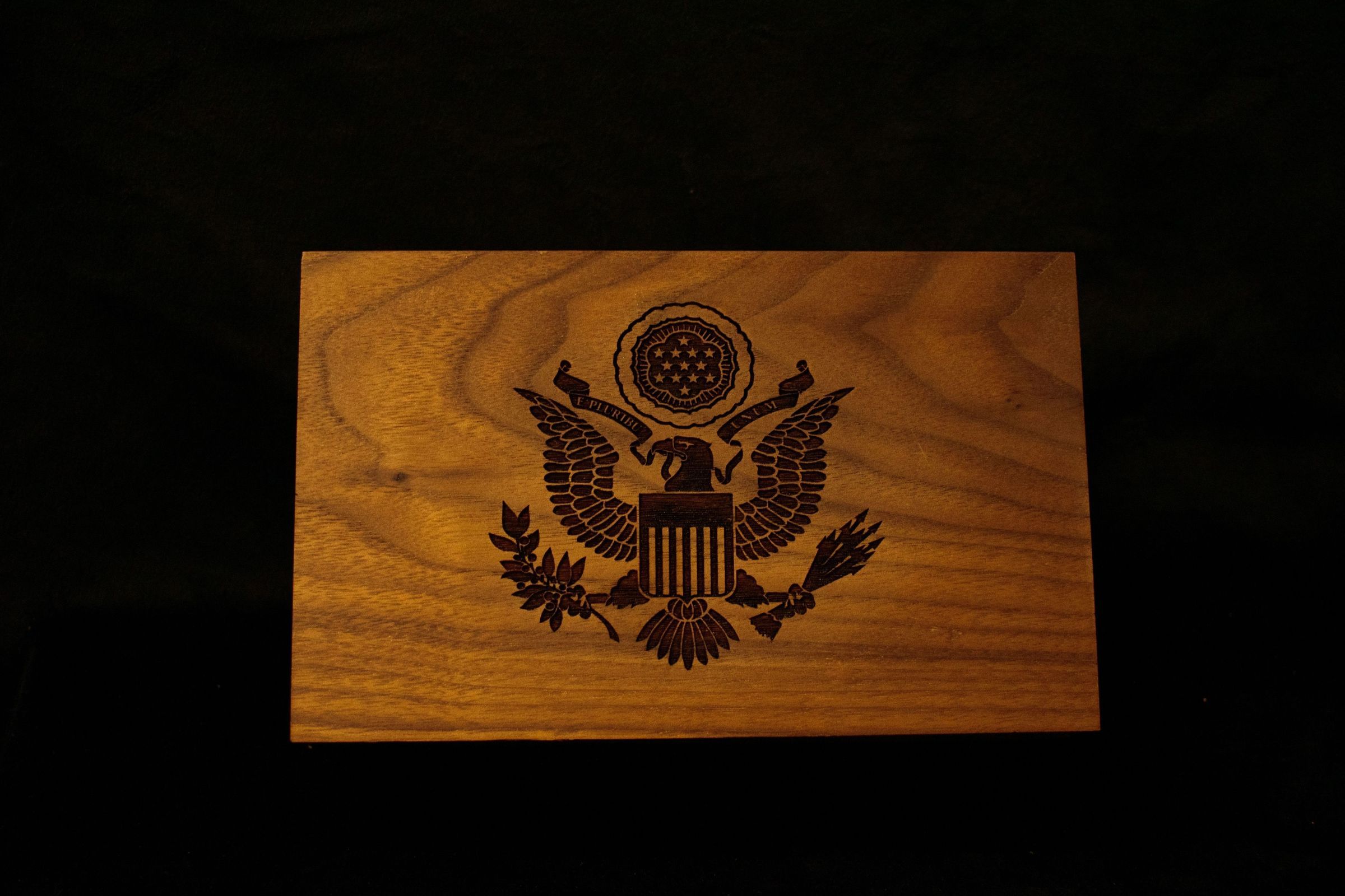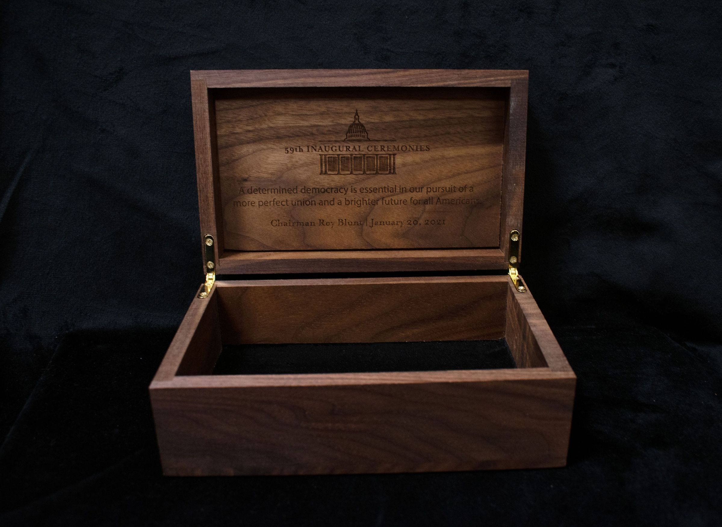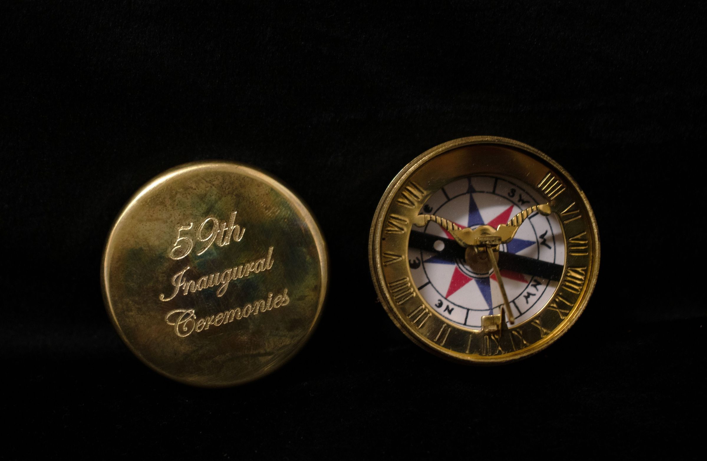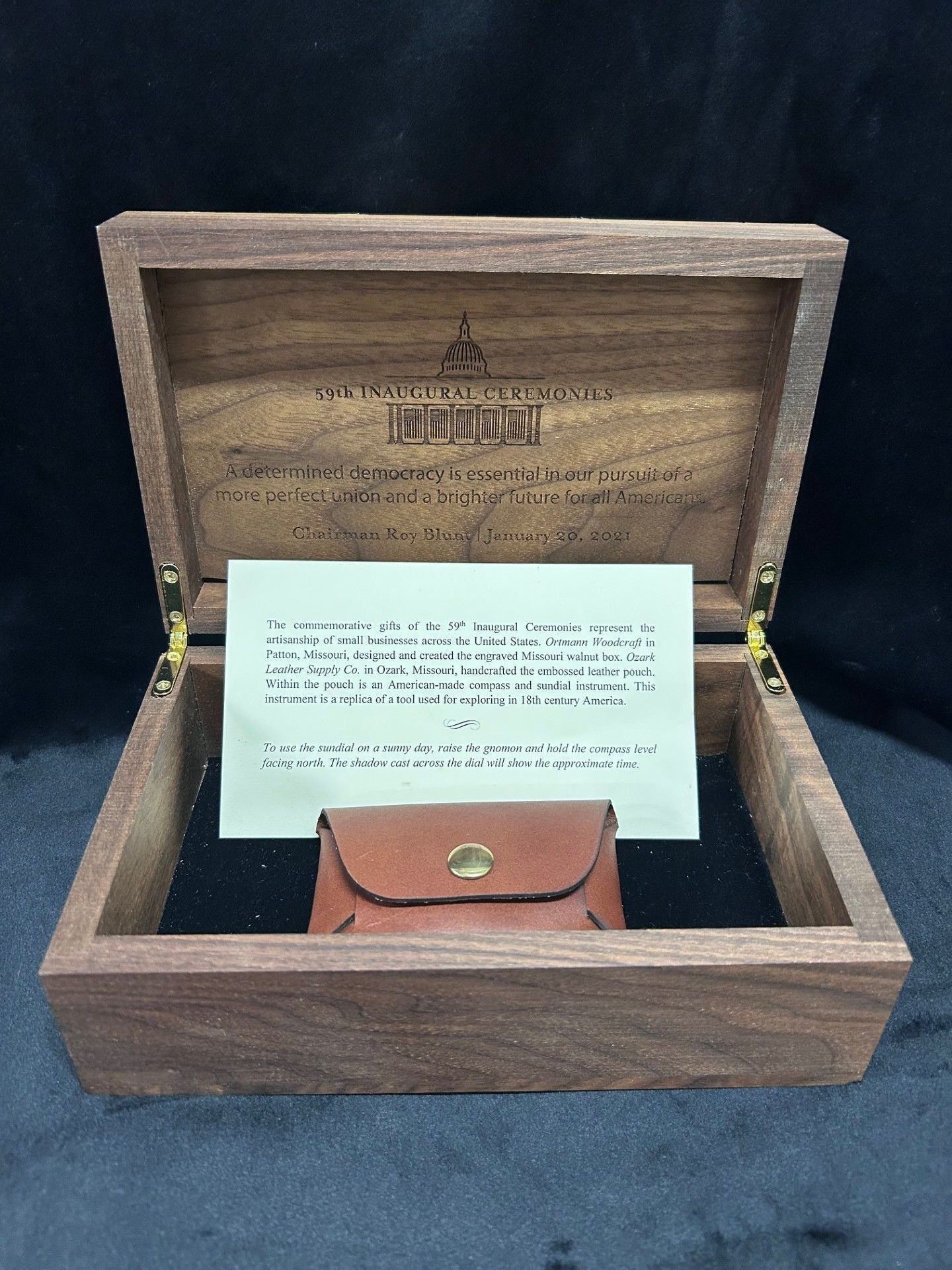 Carved wooden box with leather cased compass and informational card from the 59th Inaugural Ceremonies.Collection