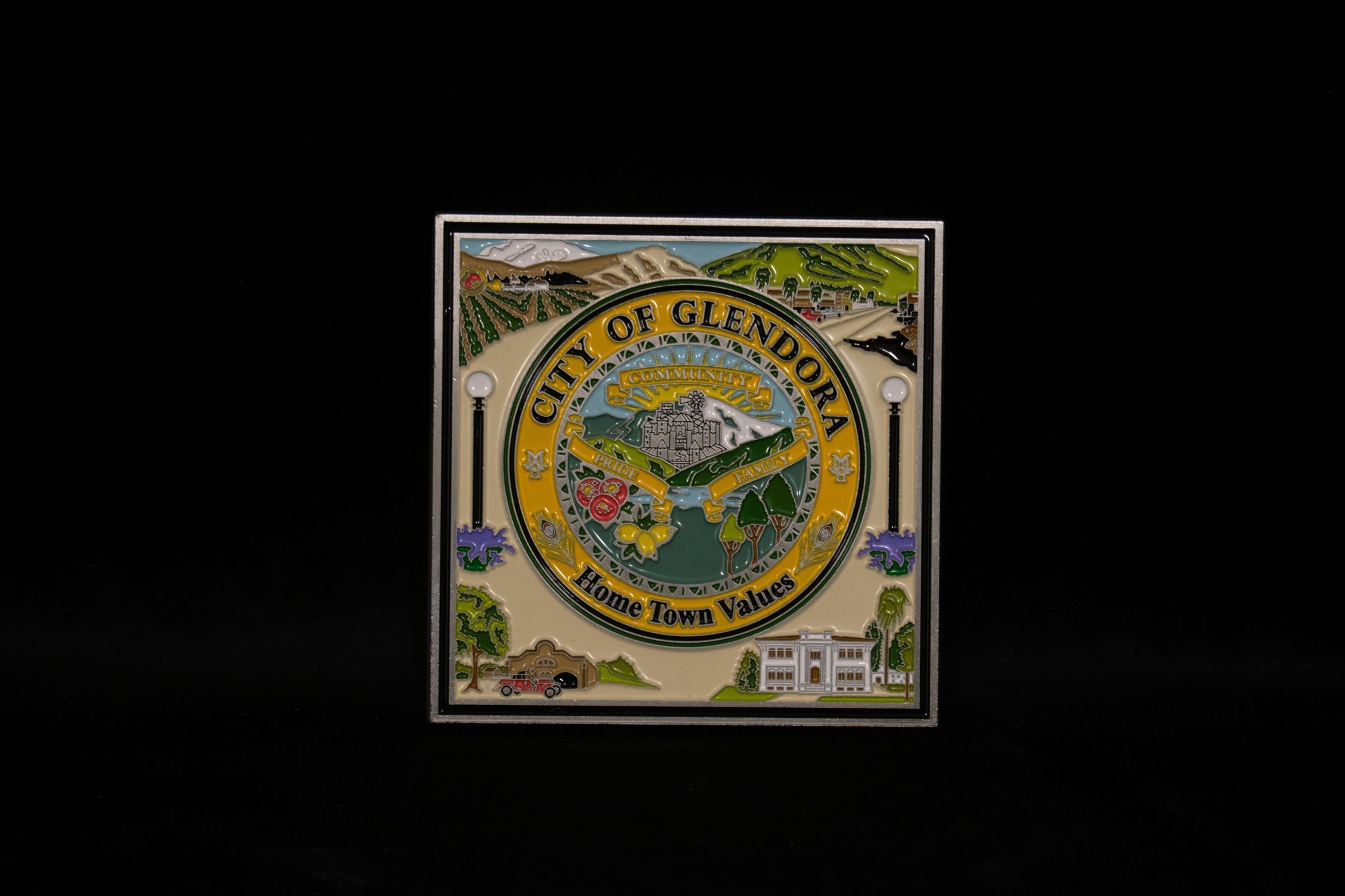 Small metal square with design and inscription reading "Home Town Values."Collection