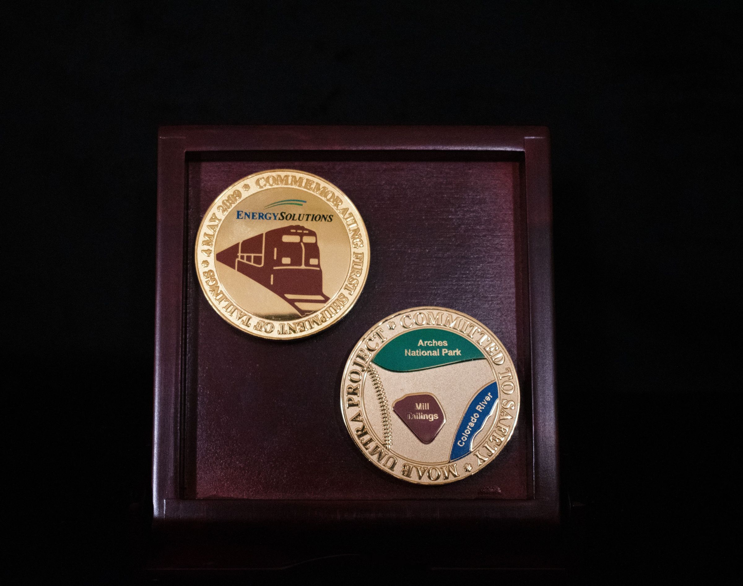 Gold coins in wooden box. First coin reads "Energy Solutions, Commemorating First Shipment of Tailings, 4 May 2009. Second Coin reads "Moab UMTRA Project, Committed to Safety, Arches National Park, Mill Tailings, Colorado River."Collection