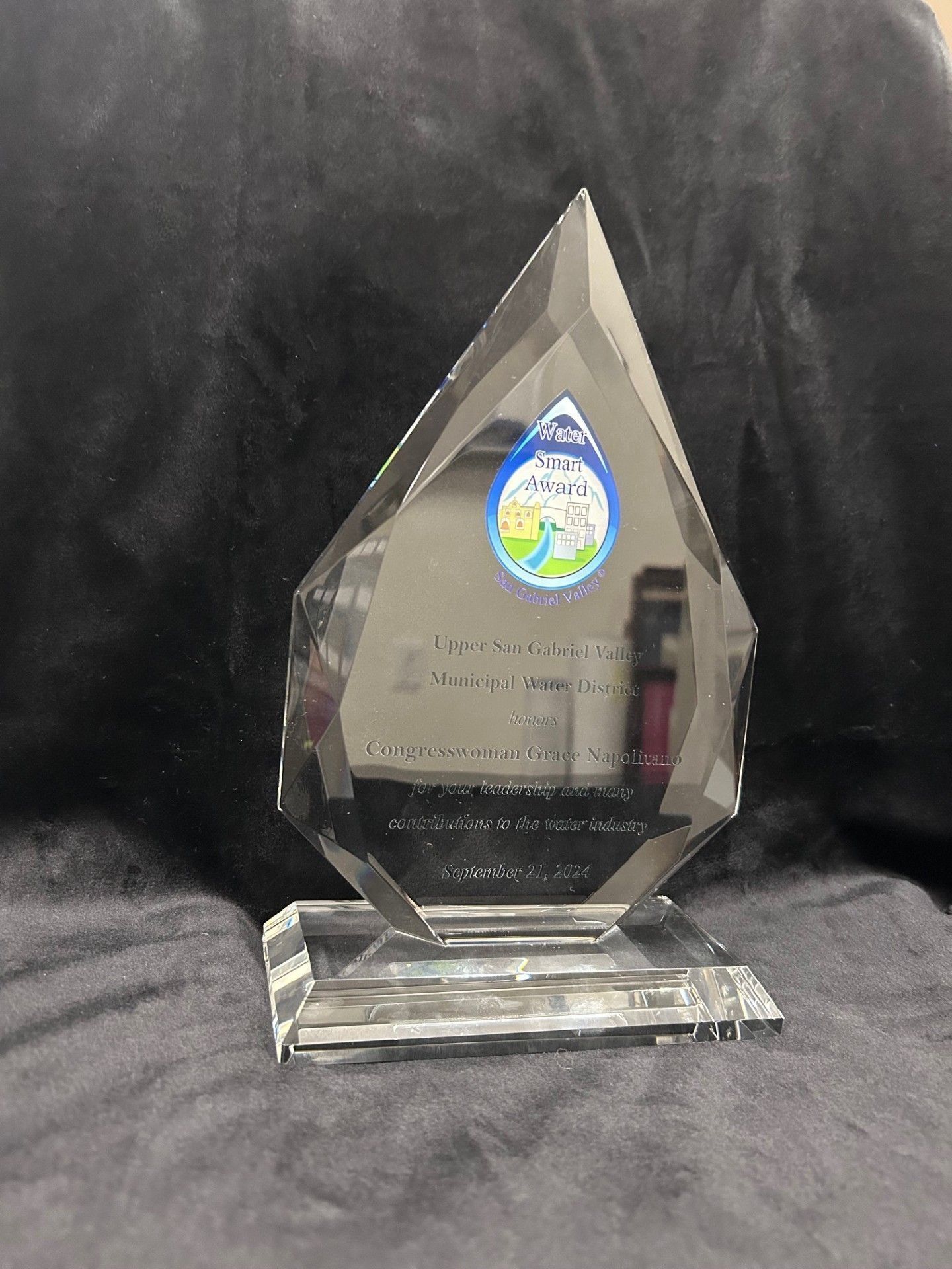 Glass award statue from the Upper San Gabriel Valley Municipal Water District reading "Water Smart Award, San Gabriel Valley. Upper San Gabriel Valley Municipal Water District honors Congresswoman Grace Napolitano for your leadership and many contributions to the water industry, September 21, 2024."Collection