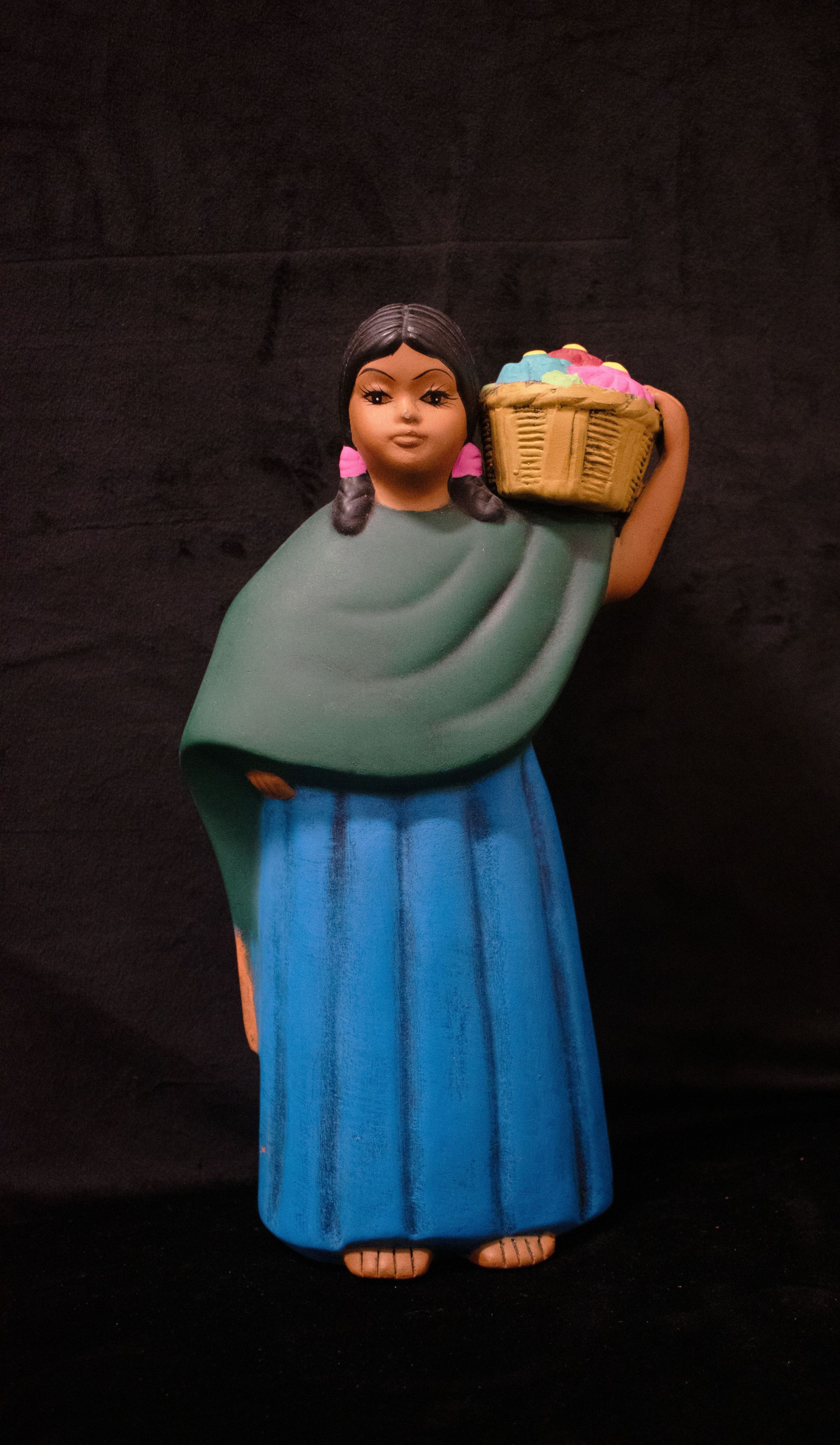 Ceramic Mexican doll in a blue dress with a basket.Collection