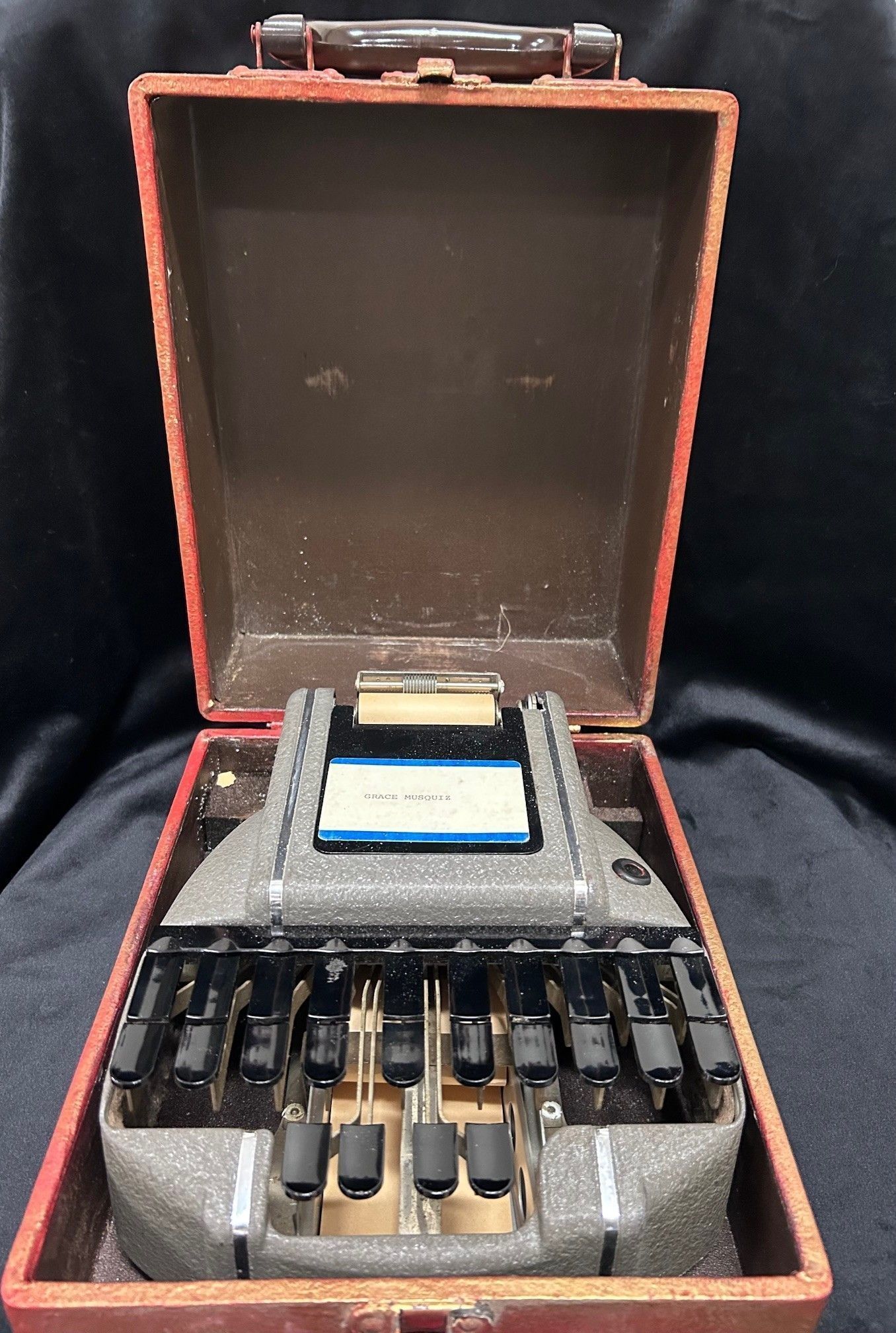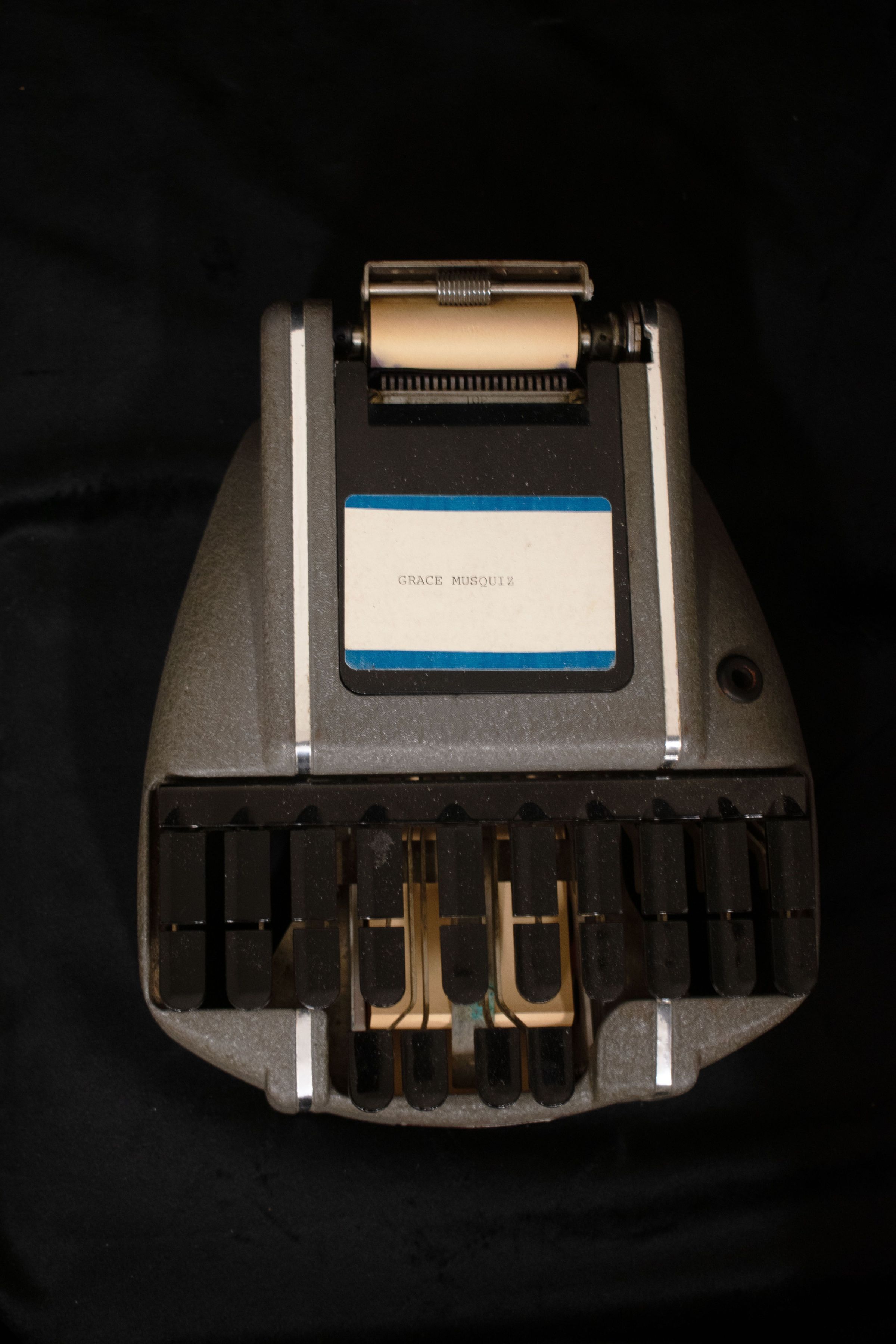 Stenotype machine in red metal box used by Grace Napolitano (Musquiz) while she attended Cerritos College.Collection
