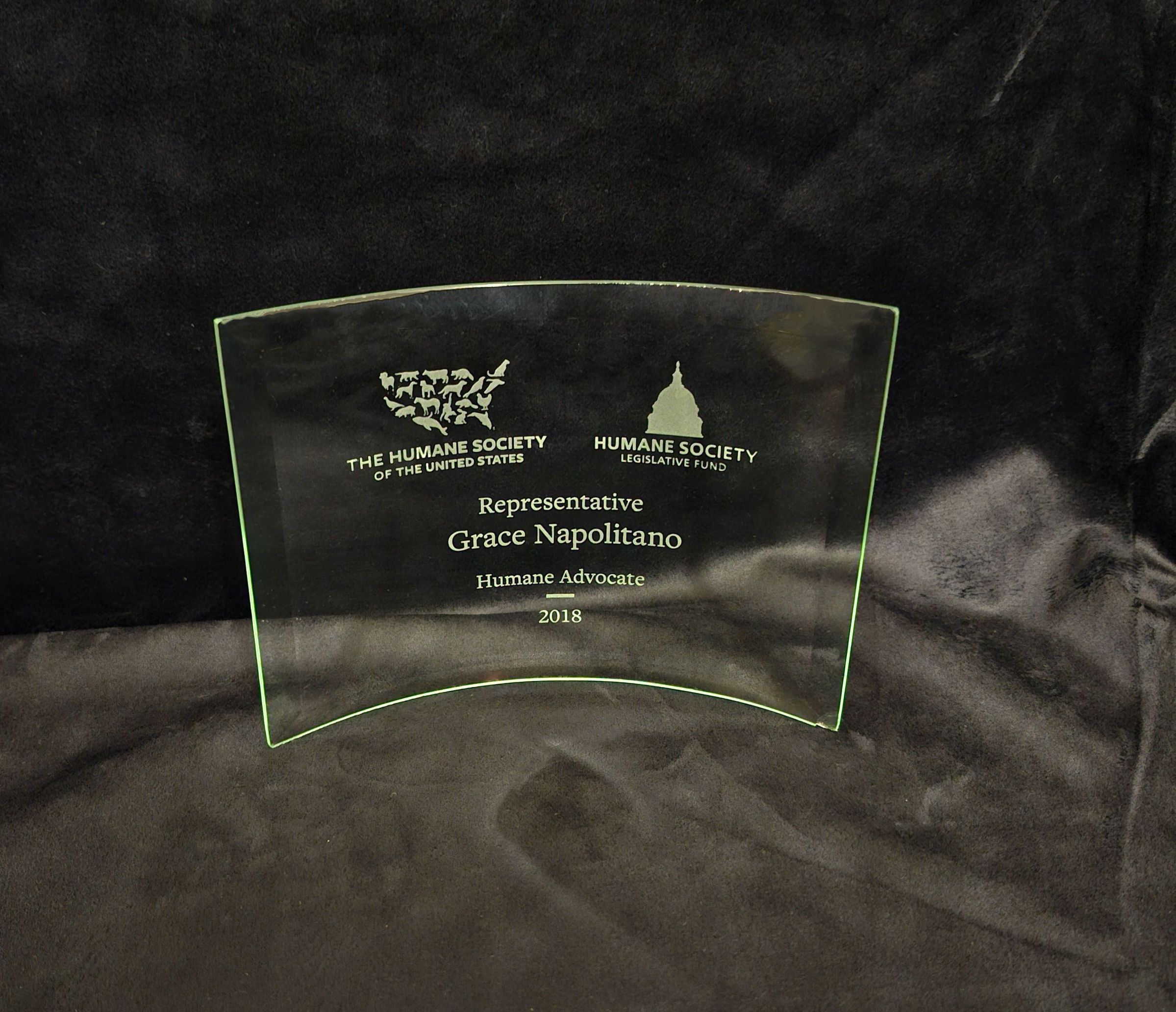 Curved glass plate award from the Humane Society of the United States and the Humane Society Legislative Fund reading "Representative Grace F. Napolitano, Humane Advocate, 2018."Collection