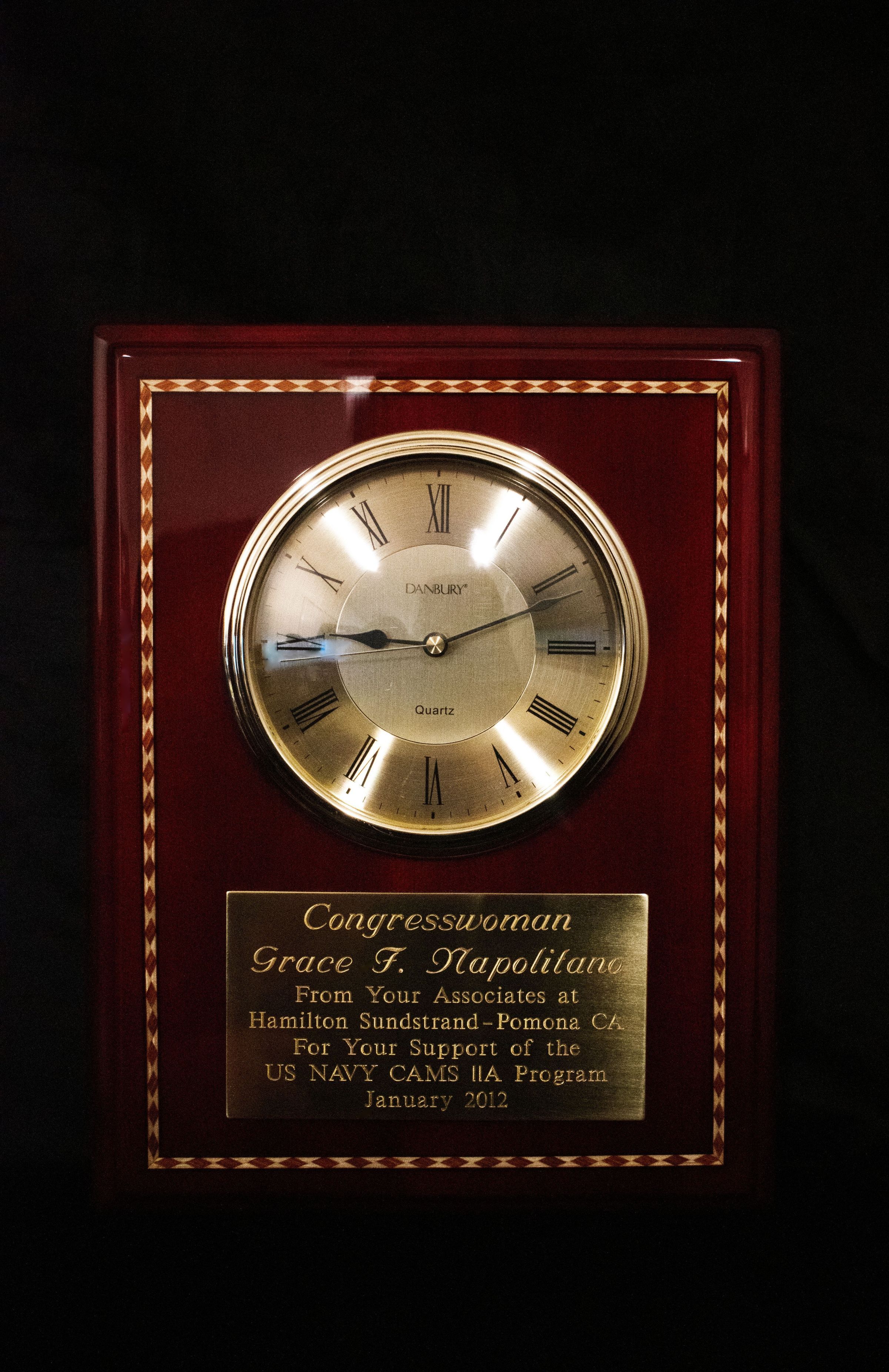 Clock mounted inside a wooden plaque from Hamilton Sundstrand reading "Congresswoman Grace F. Napolitano, From Your Associates at Hamilton Sundstrand - Pomona CA, For Your Support of the US NAVY CAMS IIA Program, January 2012."Collection