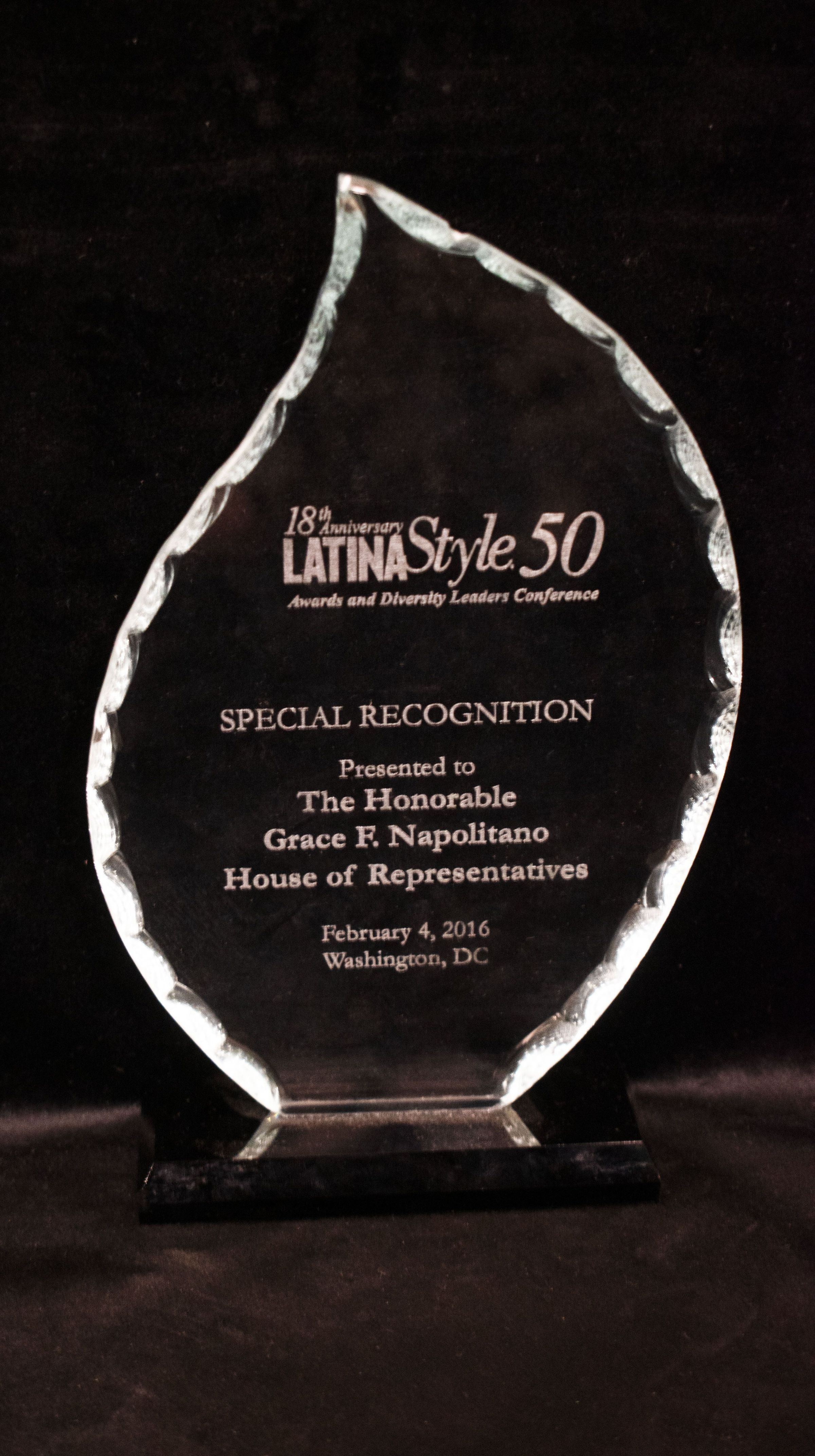Glass award statue from LATINA Style reading "18th Anniversary LATINA Style 50, Awards and Diversity Leaders Conference, Special Recognition, Presented to The Honorable Grace F. Napolitano, House of Representatives, February 4, 2016, Washington, DC."Collection