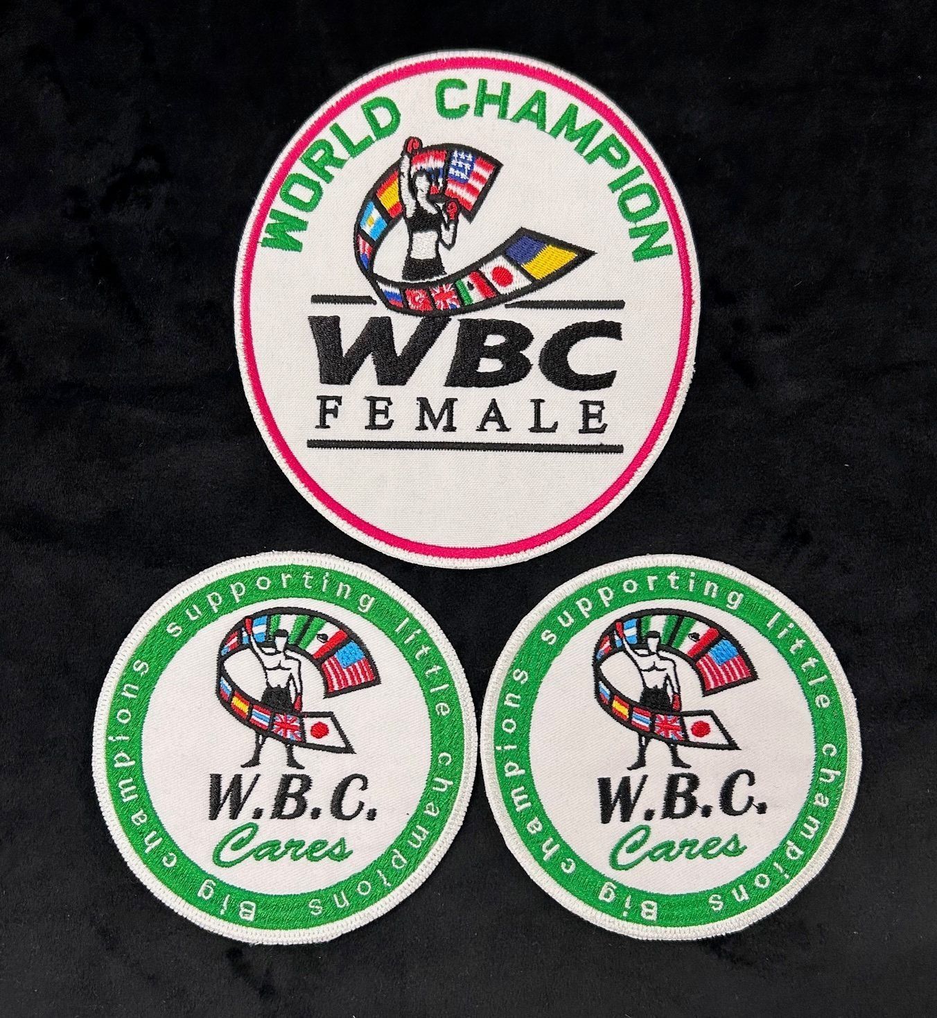 One large patch reading "World Champion, WBC Female" and two small patches reading "big champions supporting little champions, W.B.C. Cares."Collection
