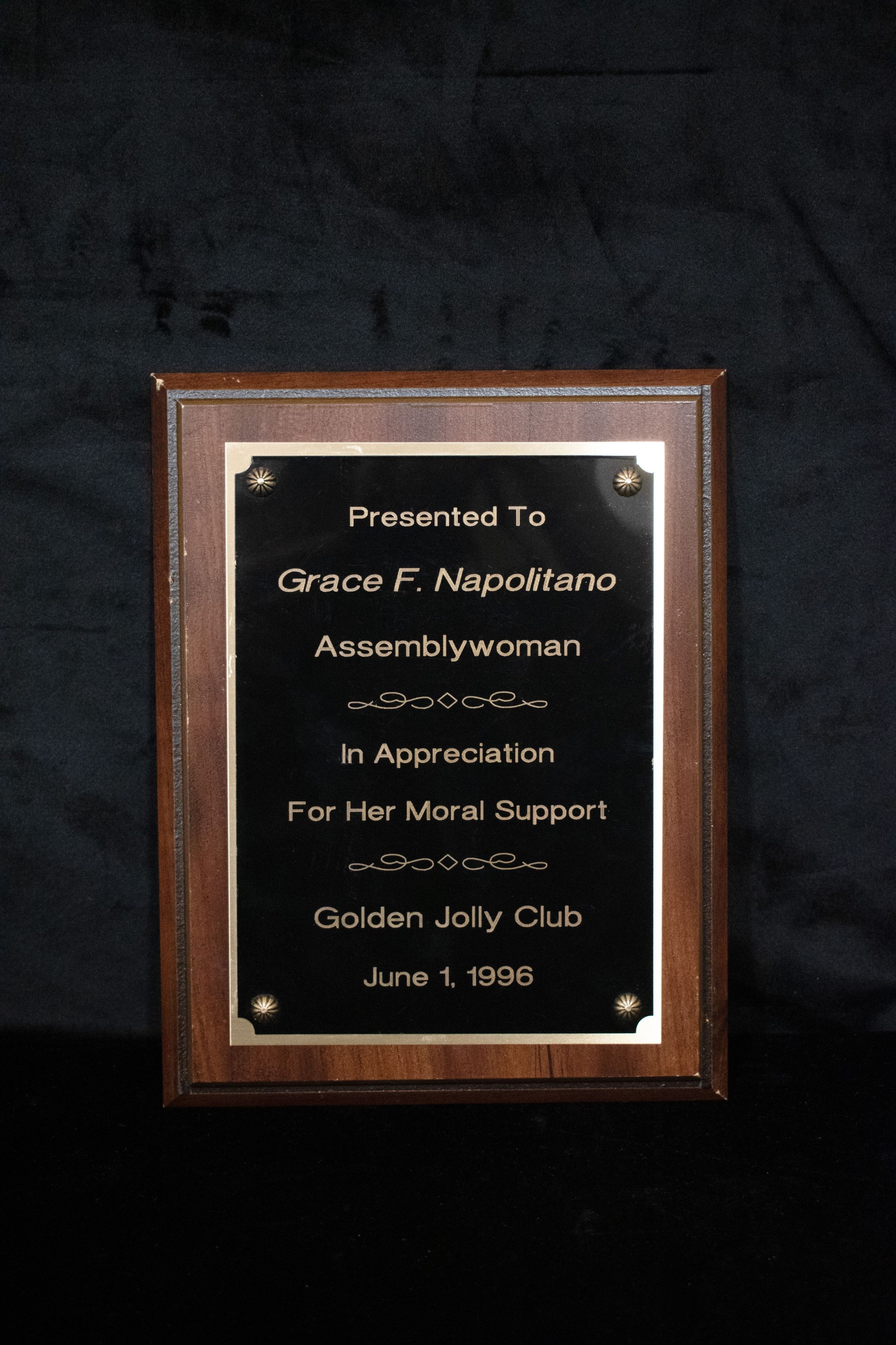 Wooden plaque from the Golden Jolly Club reading "Presented To Grace F. Napolitano, Assemblywoman, In Appreciation For Her Moral Support, Golden Jolly Club, June 1, 1996."Collection