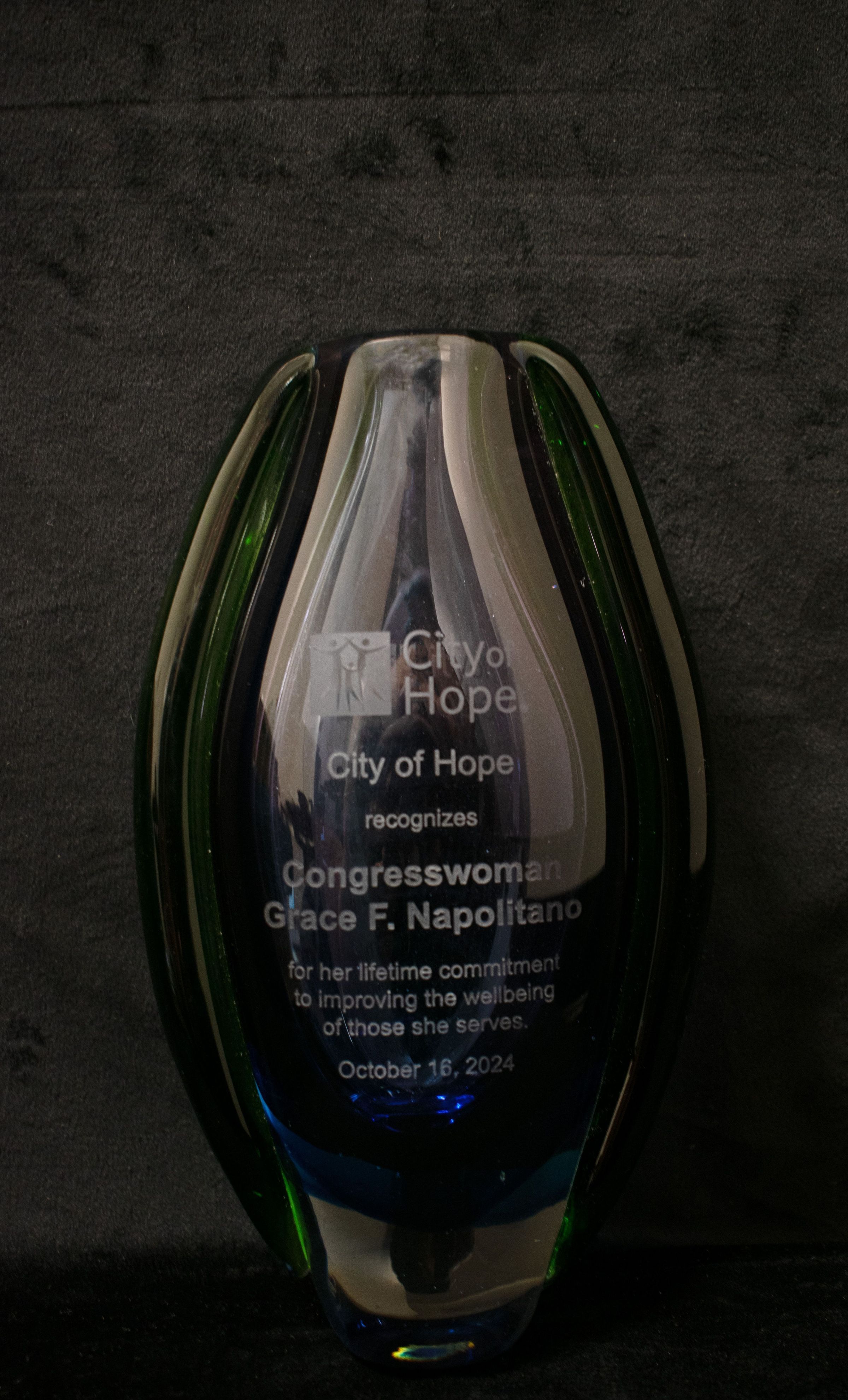 Glass award statue from City of Hope reading "City of Hope recognizes Congresswoman Grace F. Napolitano for her lifetime commitment to improving the wellbeing of those she serves, October 16, 2024."Collection