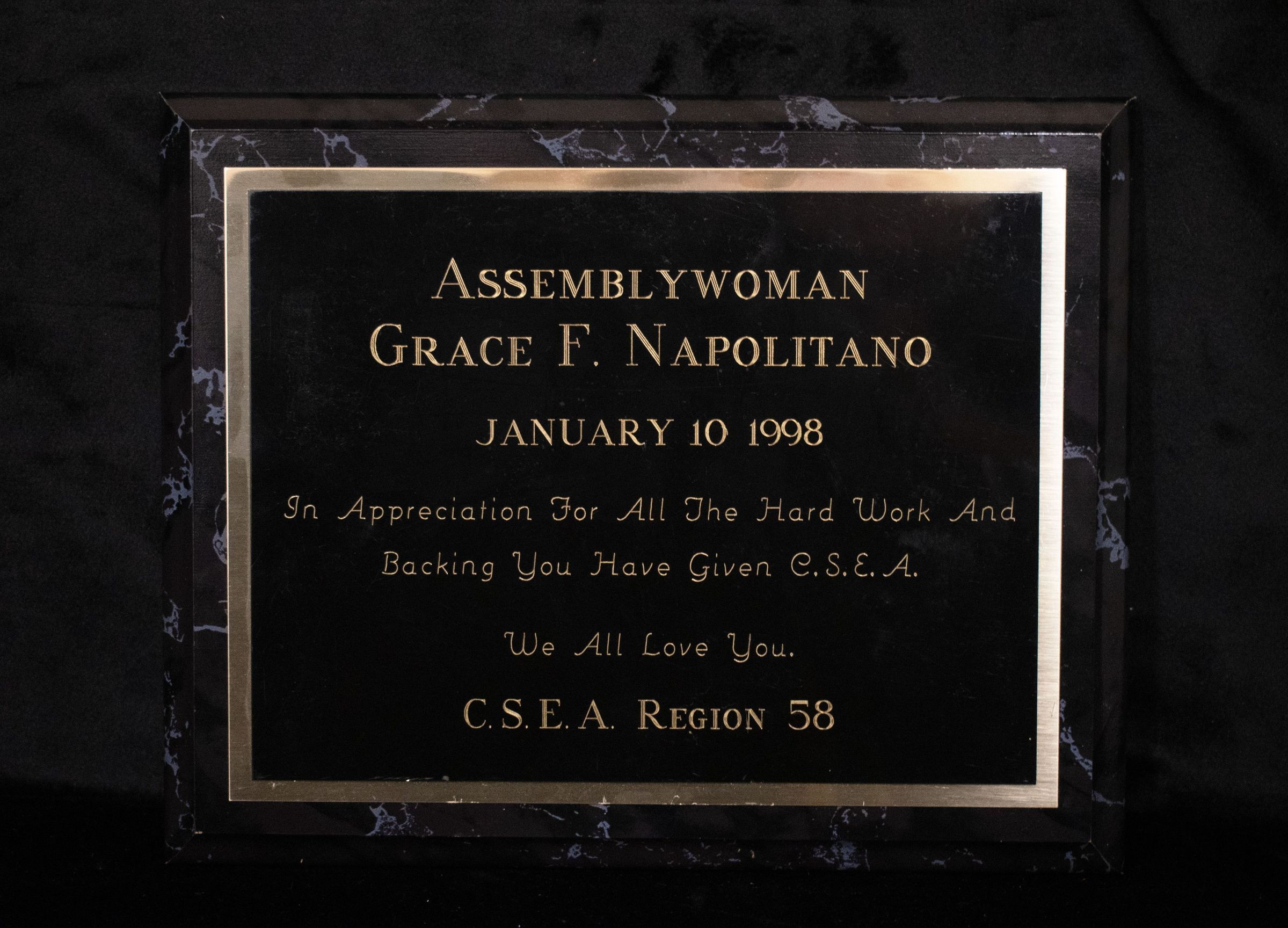 Wooden plaque from C.S.E.A. Region 58 reading "Assemblywoman Grace F. Napolitano, January 10,1998, In Appreciation For All The Hard Work And Backing You Have Given C.S.E.A. We All Love You."Collection