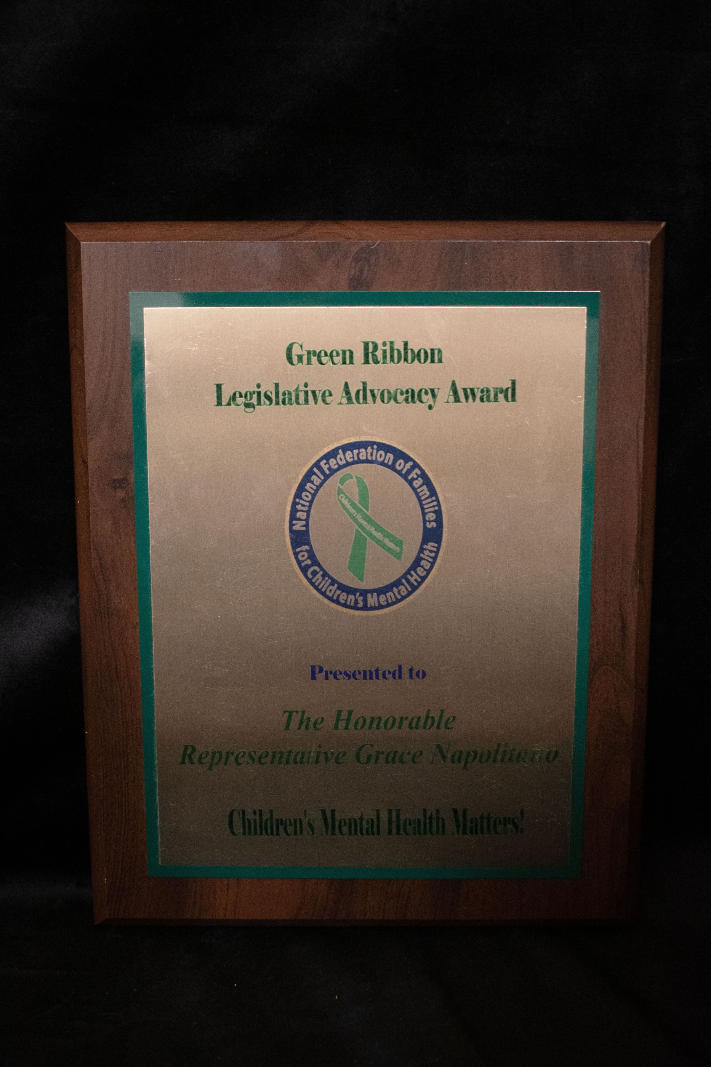 Wooden plaque from the National Federation of Families for Children's Mental Health reading "Green Ribbon Legislative Advocacy Award, Presented to The Honorable Representative Grace Napolitano, Children's Mental Health Matters!"Collection