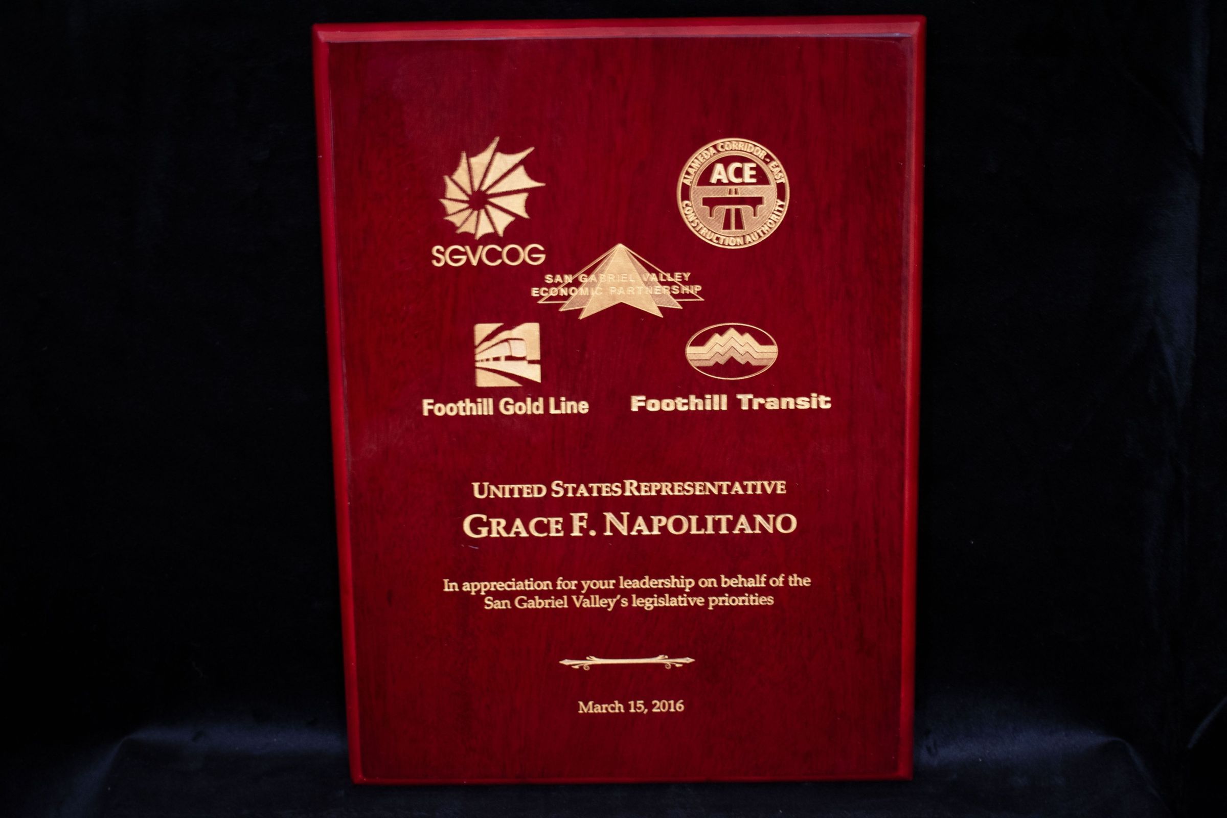Wooden plaque from SGVCOG, ACE, Foothill Gold Line, San Gabriel Valley Economic Partnership, and Foothill Transit reading "United States Representative Grace F. Napolitano, In appreciation for your leadership on behalf of the San Gabriel Valley's legislative priorities, March 15, 2016."Collection