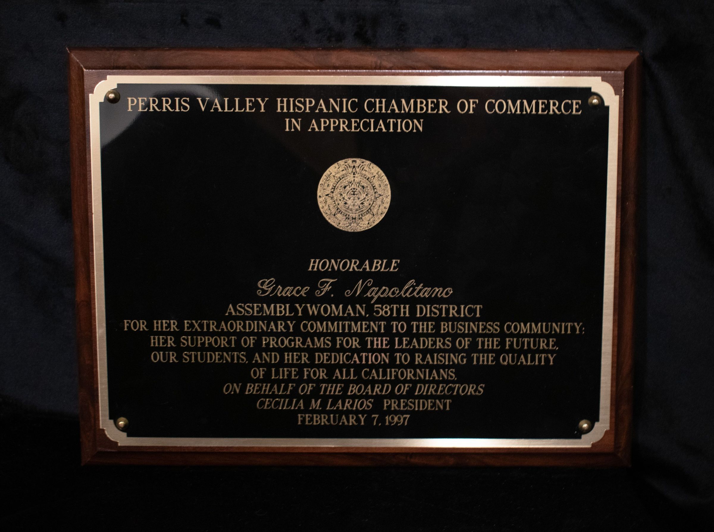 Wooden plaque from the Perris Valley Hispanic Chamber of Commerce reading "In Appreciation, Honorable Grace F. Napolitano Assemblywoman, 58th District, for her extraordinary commitment to the business community, her support of programs for the leadership of the future, our students, and her dedication to raising the quality of life for all Californians. On Behalf of the Board of Directors, Cecilia M. Larios President, February 7, 1997."Collection