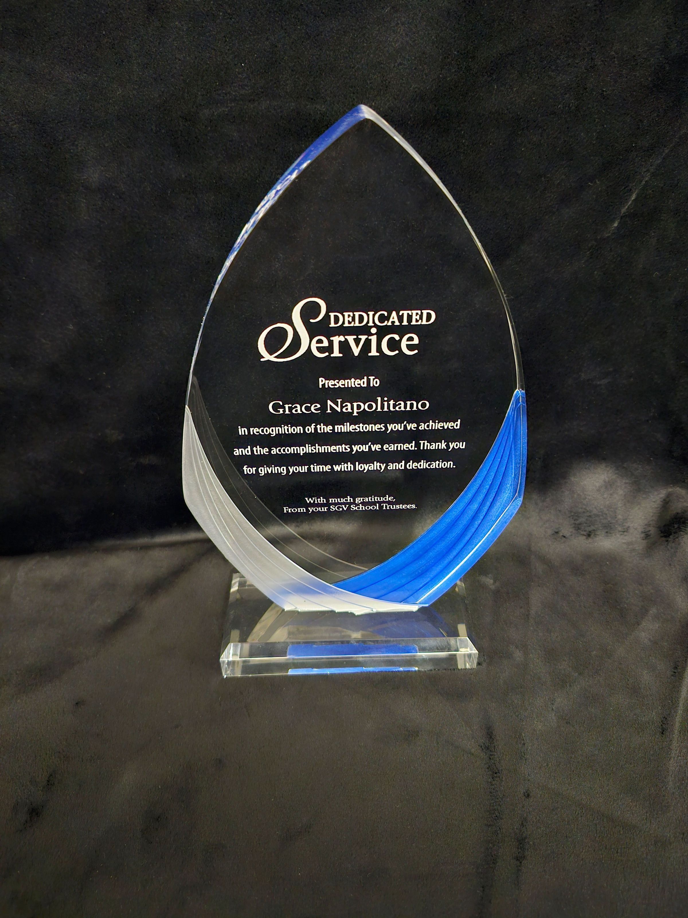 Plastic award statue from SGV School Trustees reading "Dedicated Service, Presented To Grace Napolitano, in recognition of the milestones you've achieved and the accomplishments you've earned. Thank you for giving your time with loyalty and dedication. With much gratitude, From your SGV School Trustees."Collection