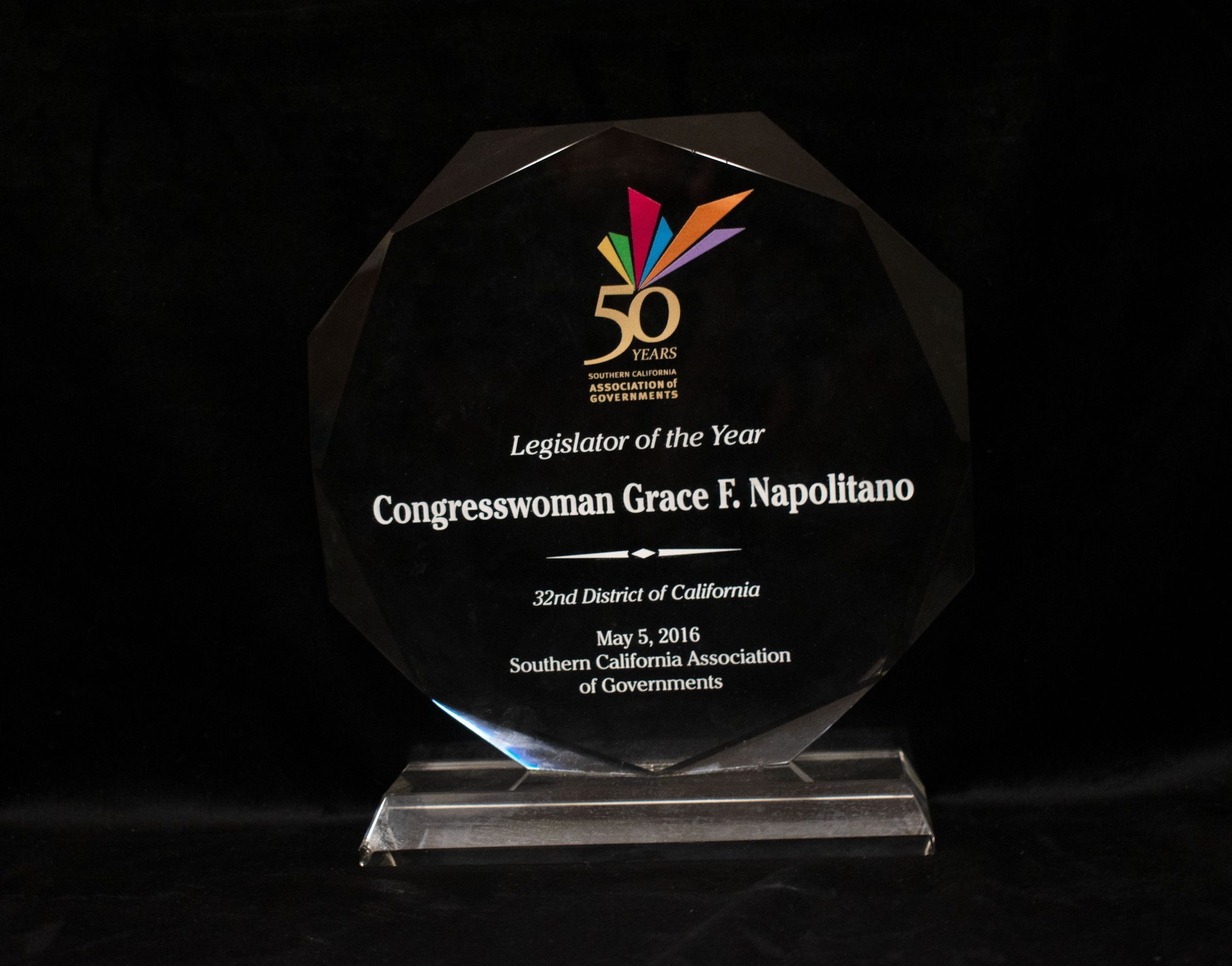 Glass award statue from the Southern California Association of Governments reading "Legislator of the Year, Congresswoman Grace F. Napolitano, 32nd District of California, May 5, 2016."Collection